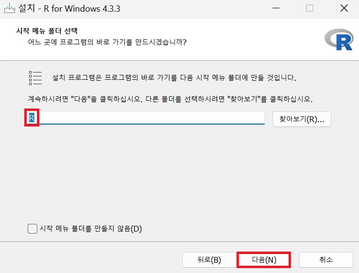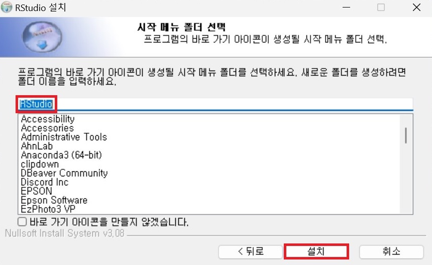시작 메뉴 폴더 선택 또한 변경 없이 넘어가고, 추가 사항 적용도 변경 없이 넘어간다.
