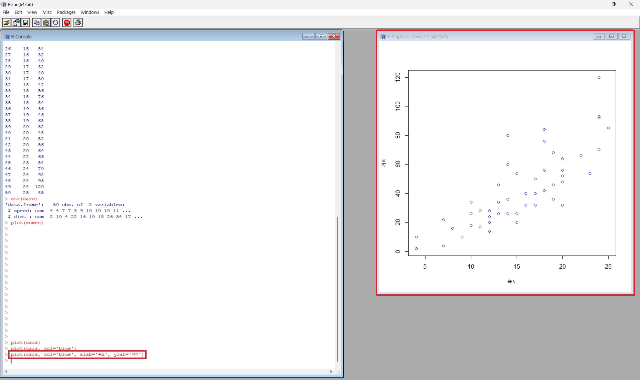 xlab과 ylab 매개변수는 각 축의 이름을 지정하는 옵션이다.