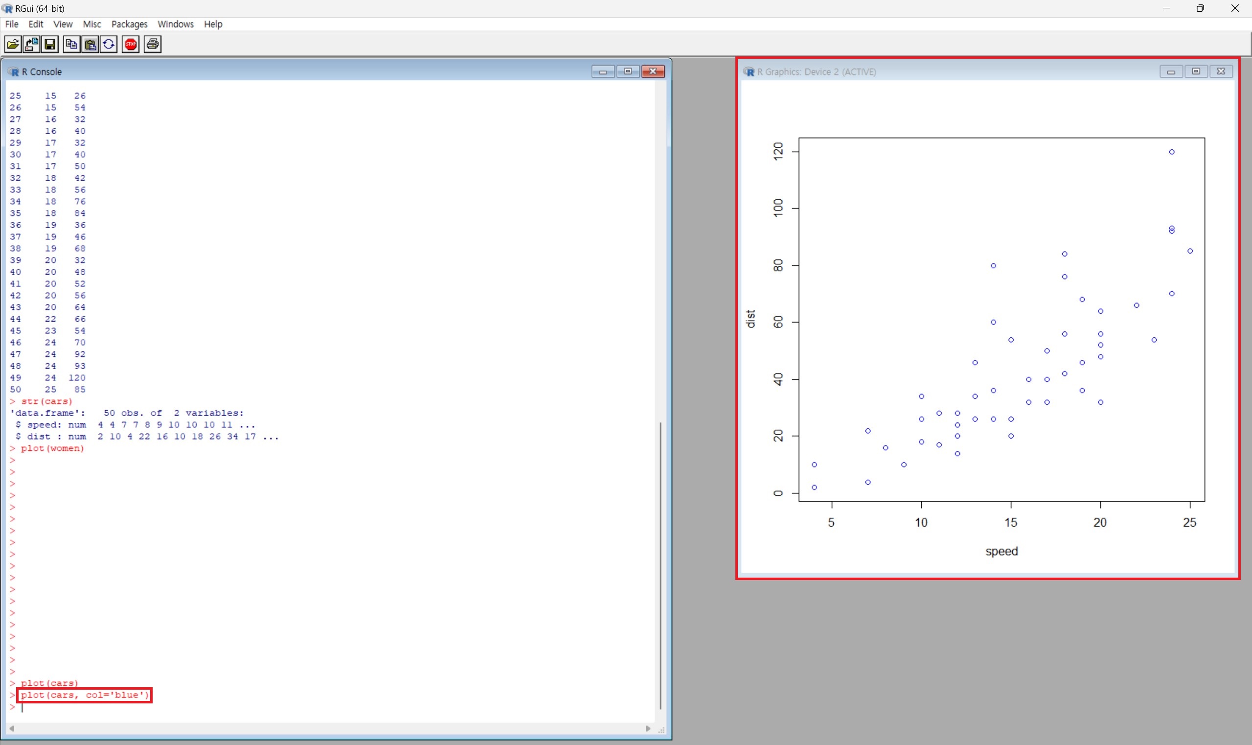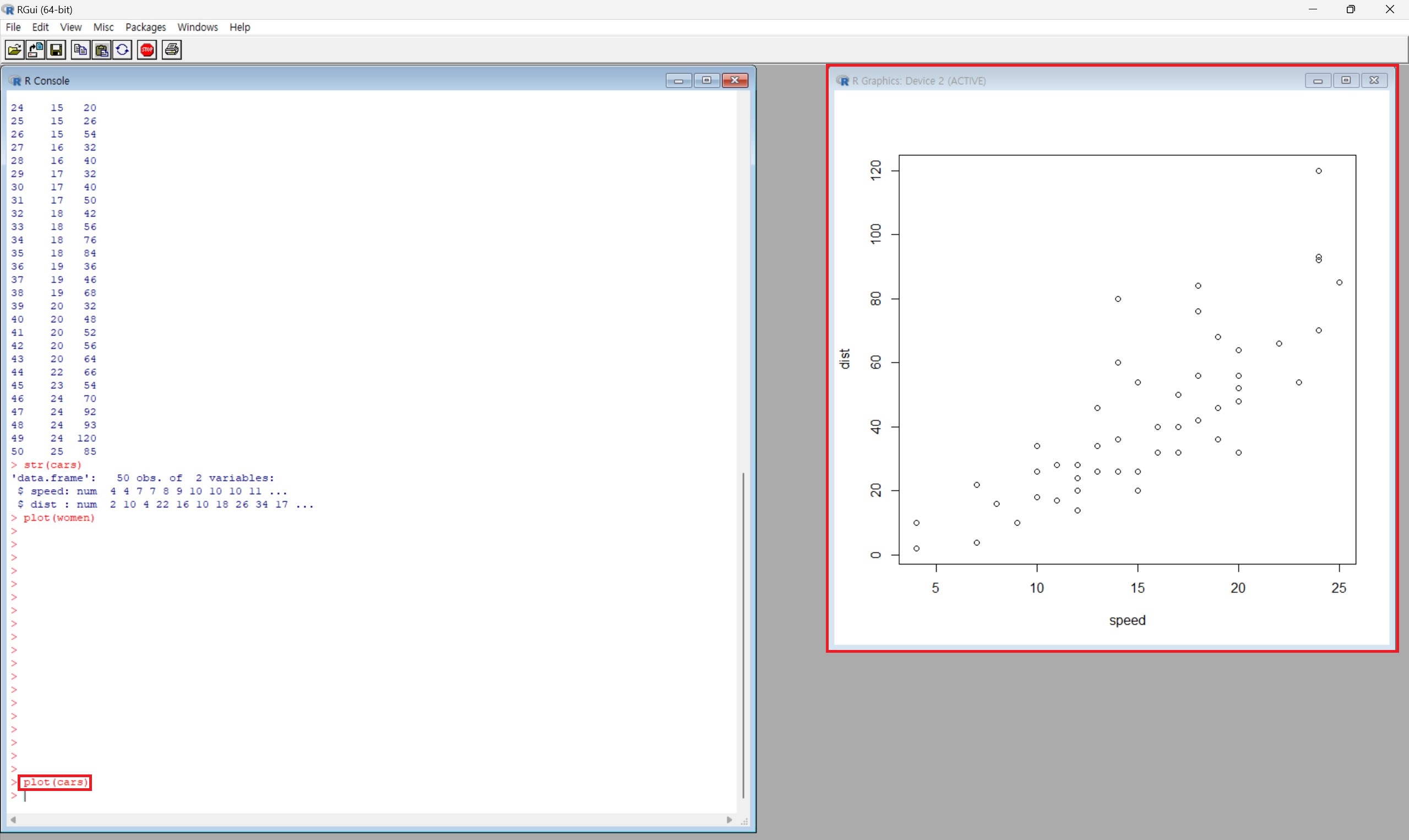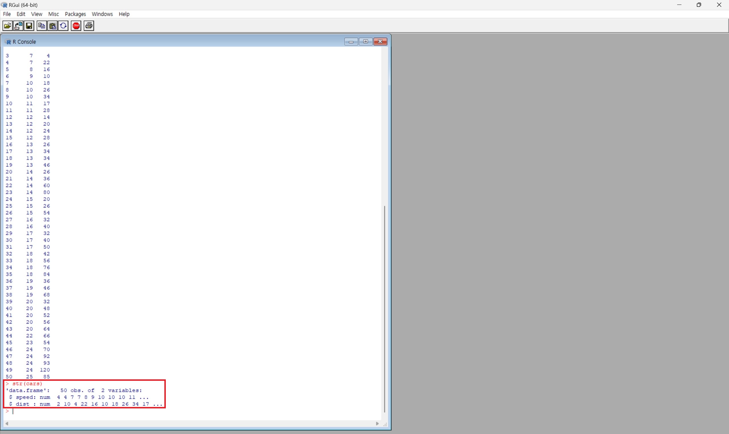 str(cars) 형식으로 명령어를 입력하면 cars 데이터의 내용을 요약해서 볼 수 있다.