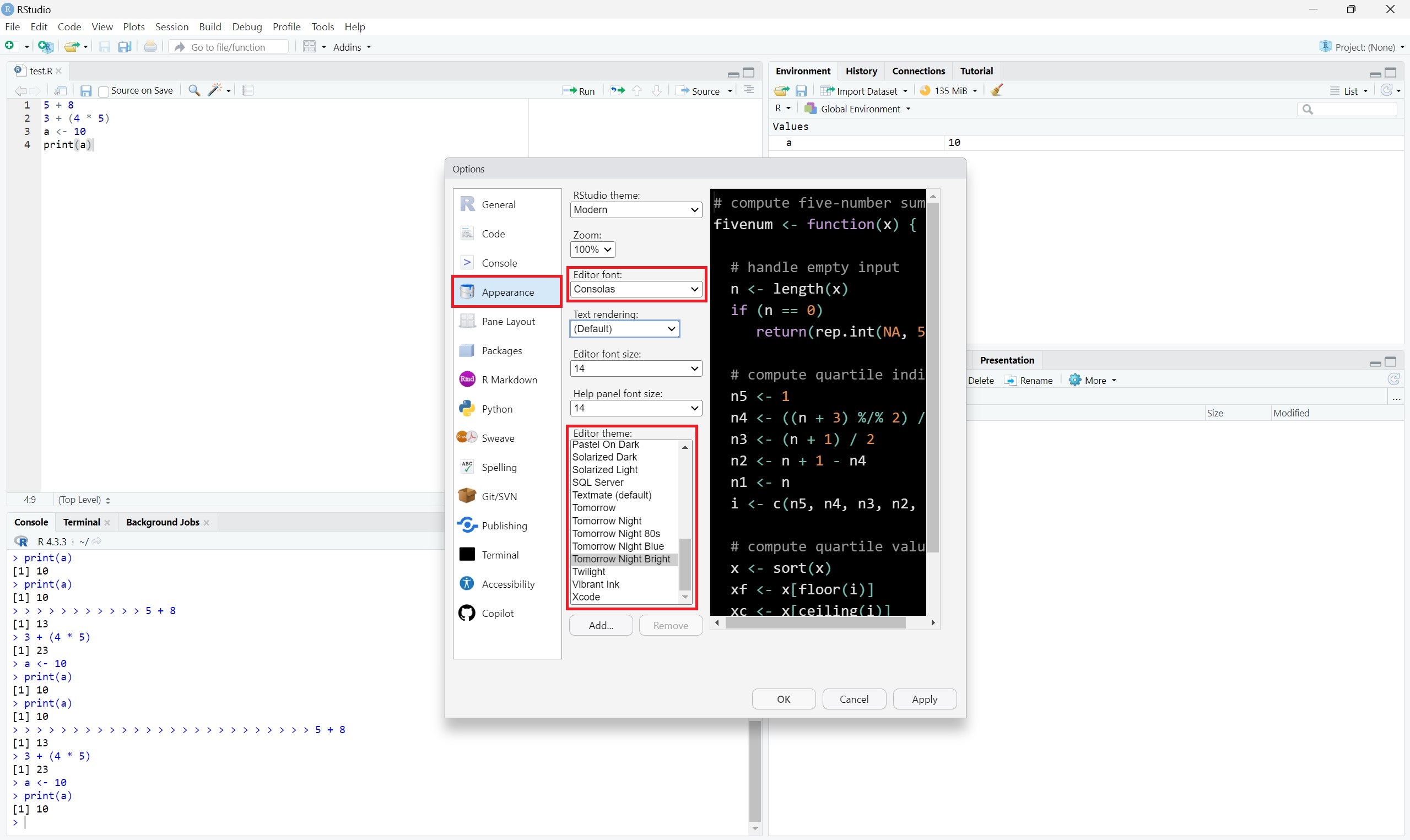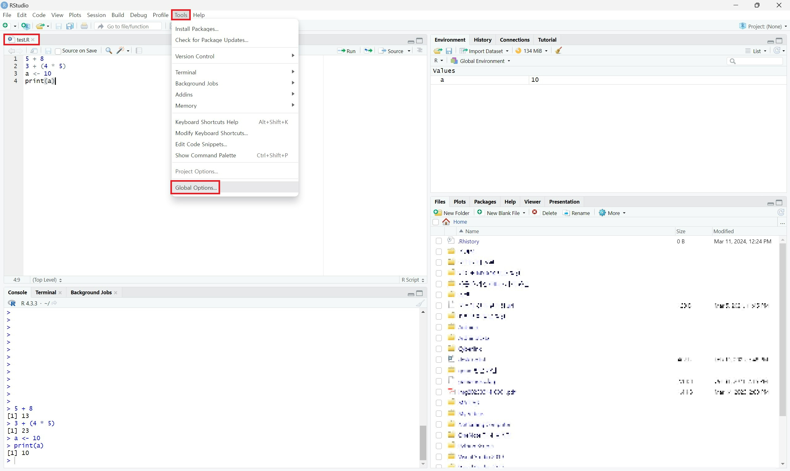 Tools에서 Global Options를 선택하면 R Studio의 각종 설정을 변경할 수 있다.