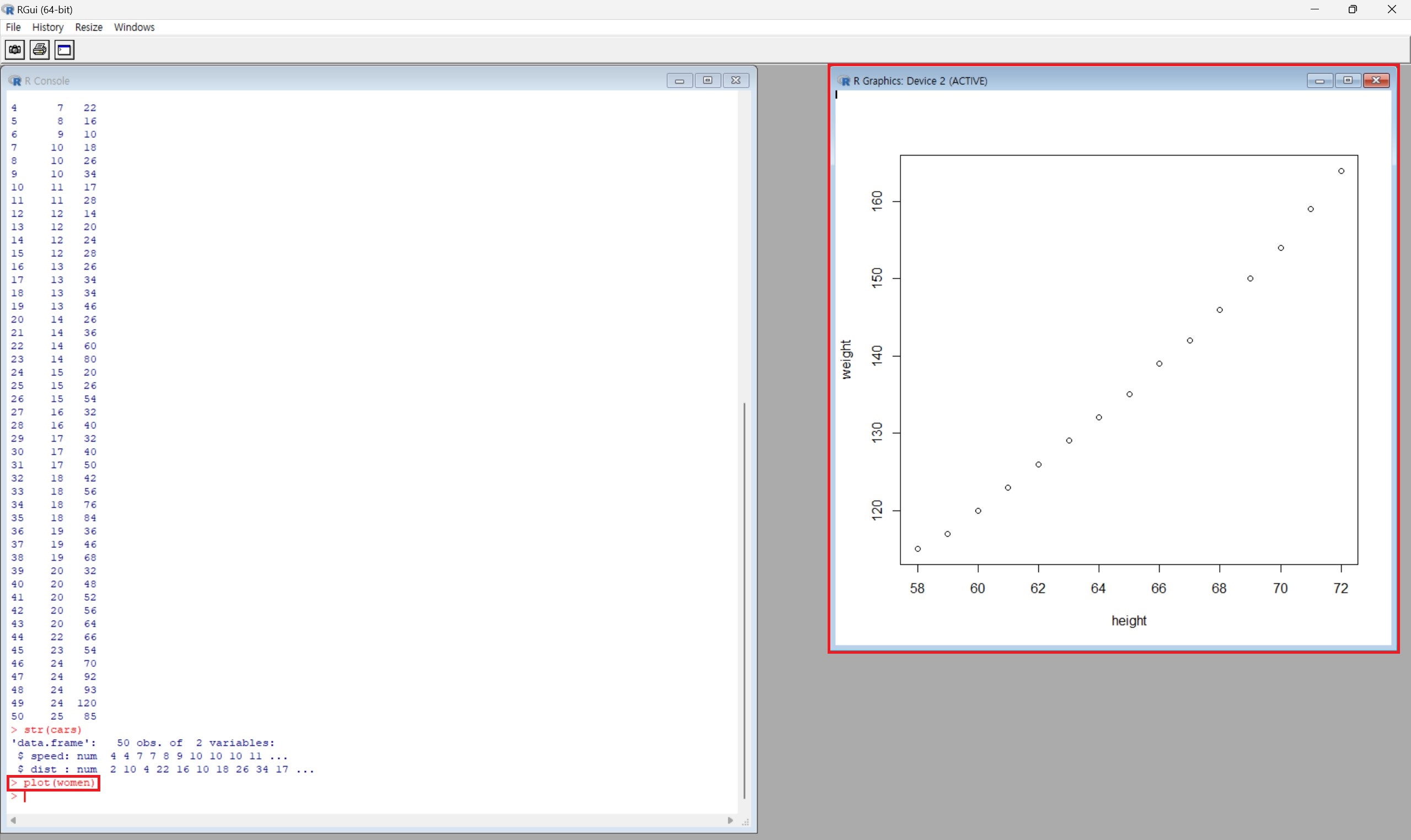 plot(women) 형식으로 명령어를 입력하면 해당 데이터를 그래프로 나타내어 준다.
