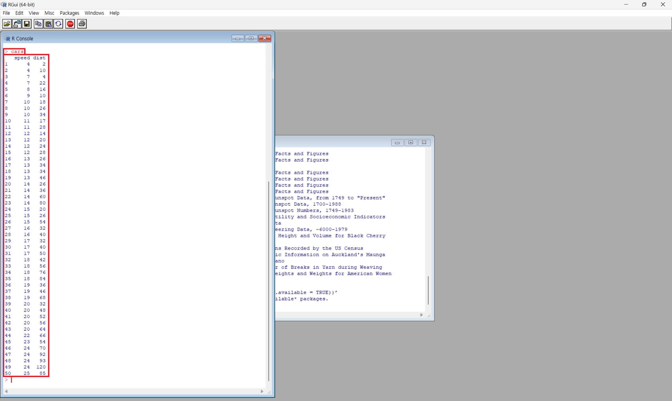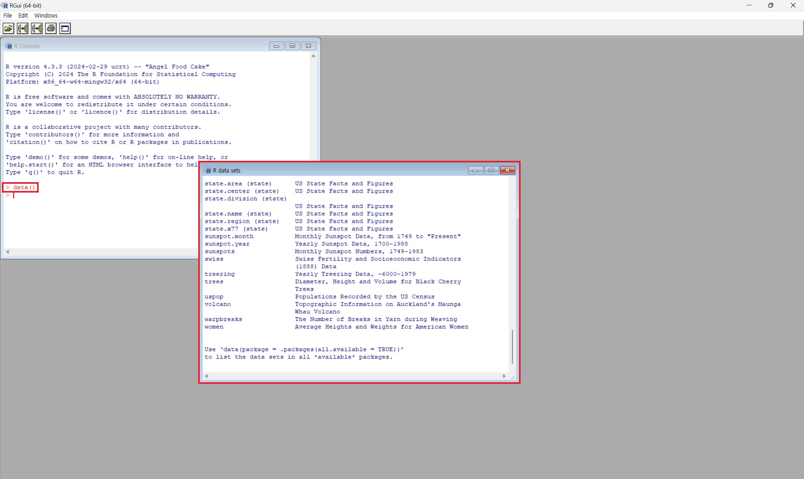 data() 명령어를 입력하면 R이 기본으로 제공하는 데이터를 확인할 수 있다.