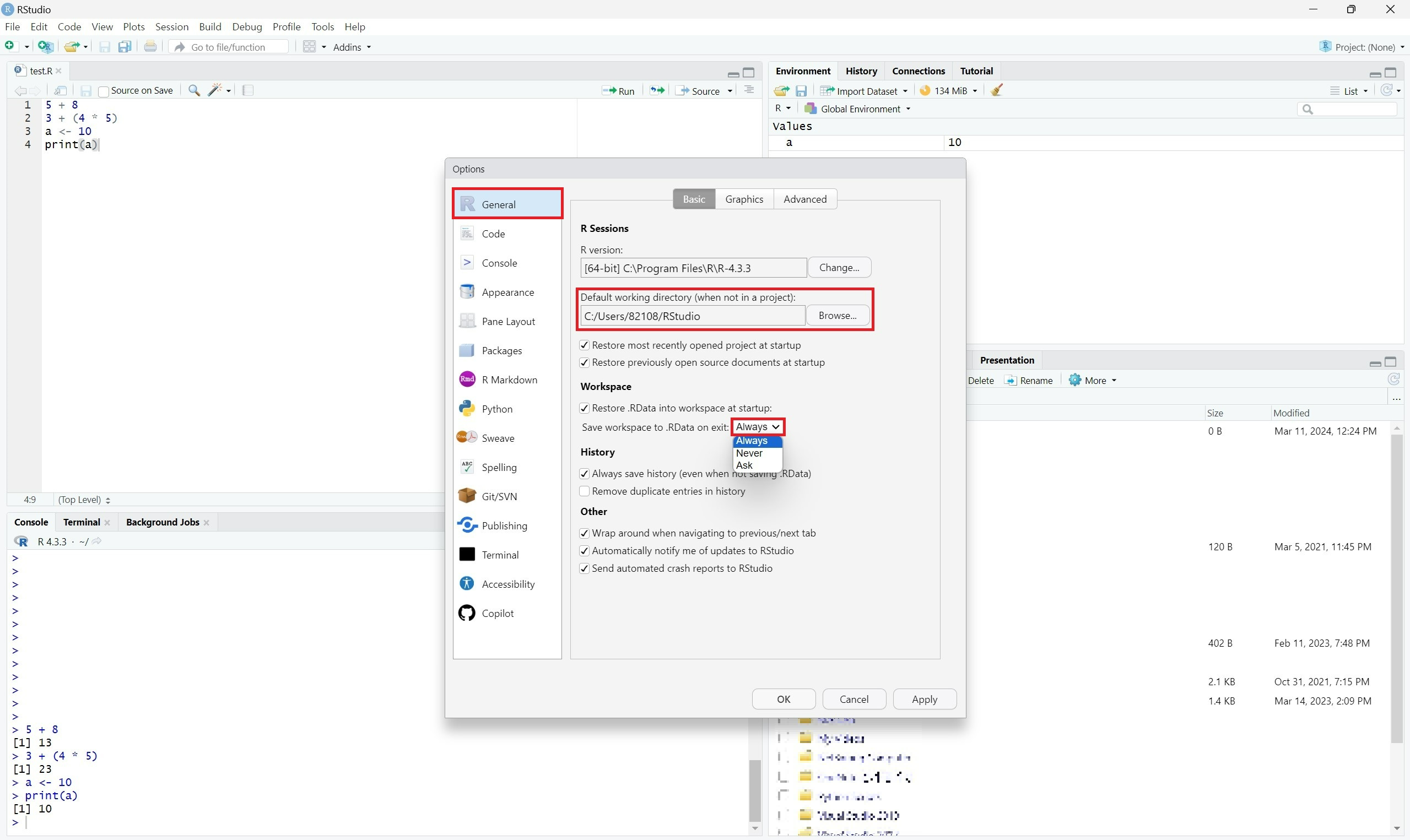 R Studio에서 변경한 내용이 항상 자동으로 저장되도록 Workspace에서 Ask를 Always로 변경해 줄 수도 있다.