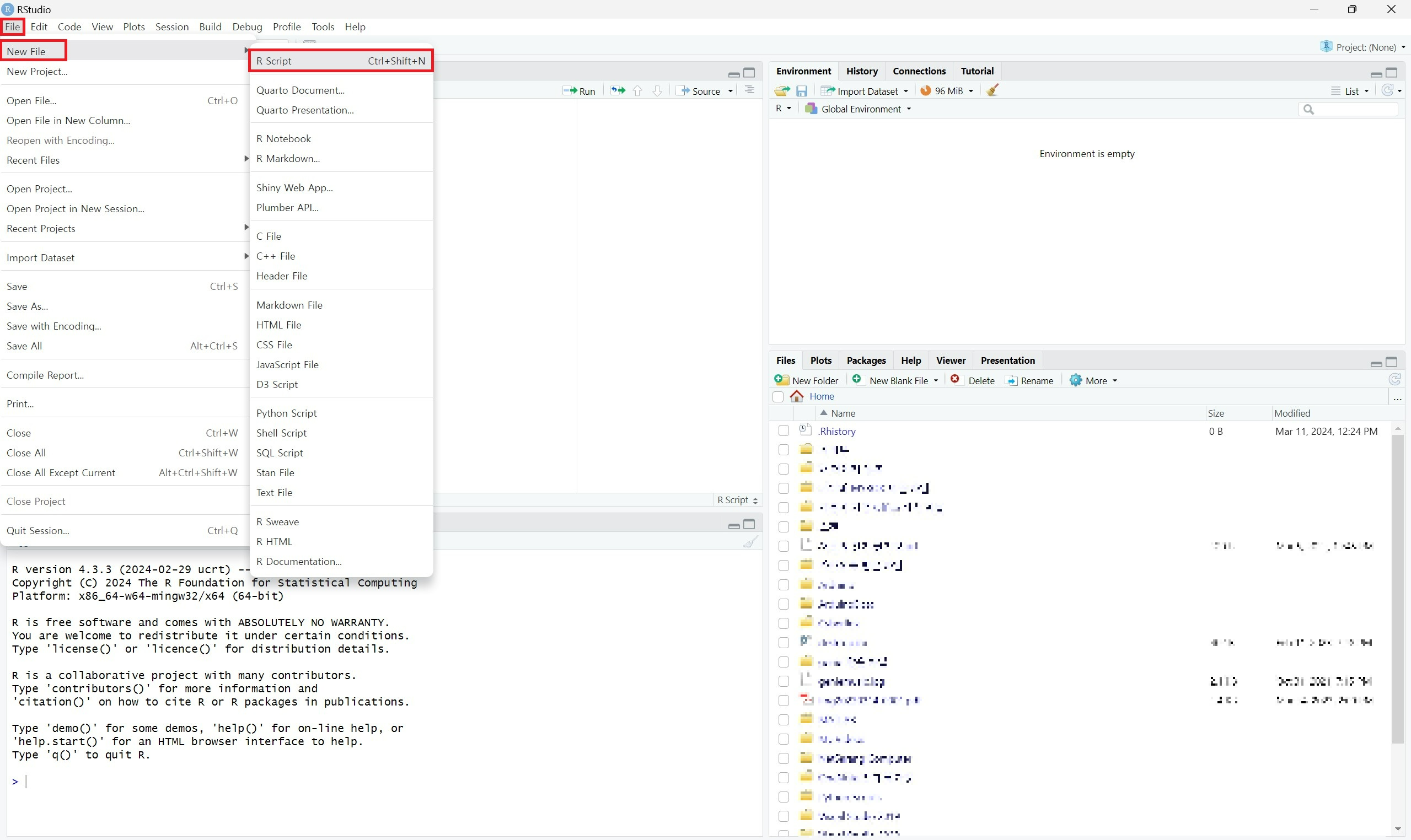 여기서 새로운 R Script 파일을 만들게 되면 4개의 영역으로 구성되게 된다.