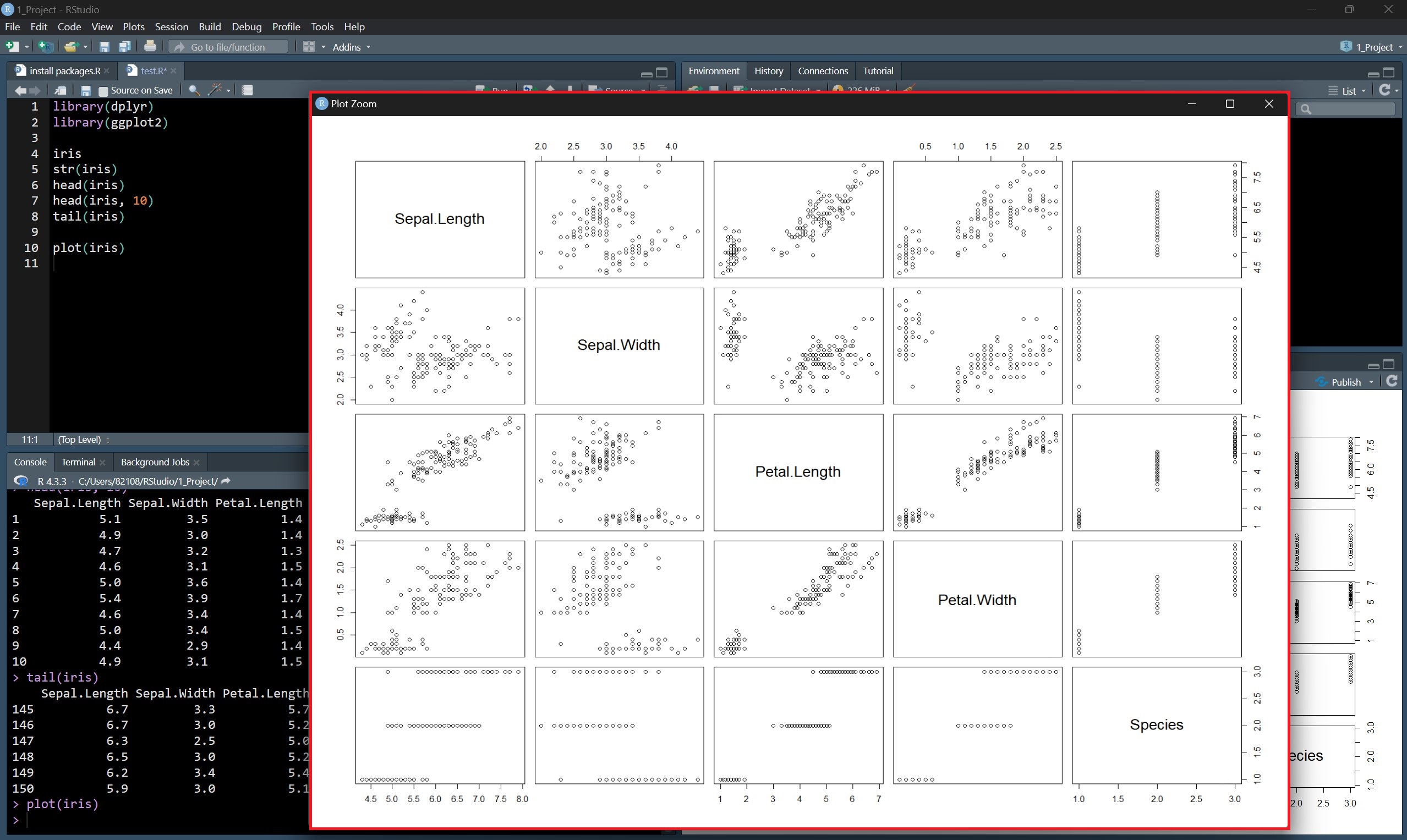 모든 속성이 아닌 특정 두 속성의 상관관계에 관한 그래프를 보고 싶다면 데이터에서 특정 열의 이름 2개를 지정해 주면 된다. 열의 이름을 지정할 때는 "데이터 이름$열 이름" 형식으로 작성해 주면 된다.