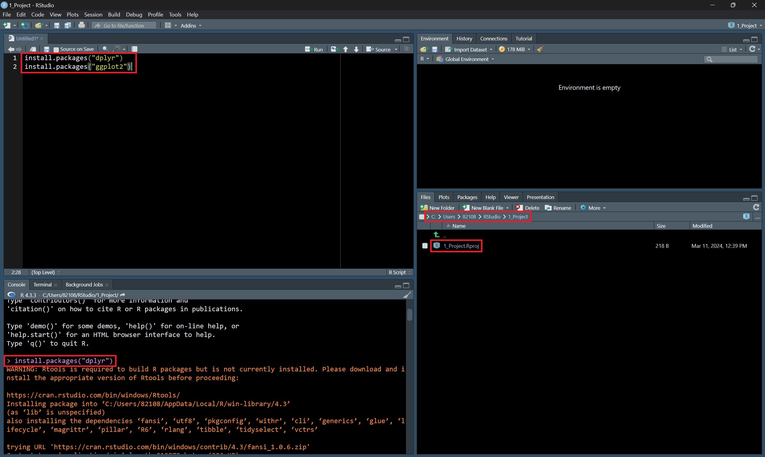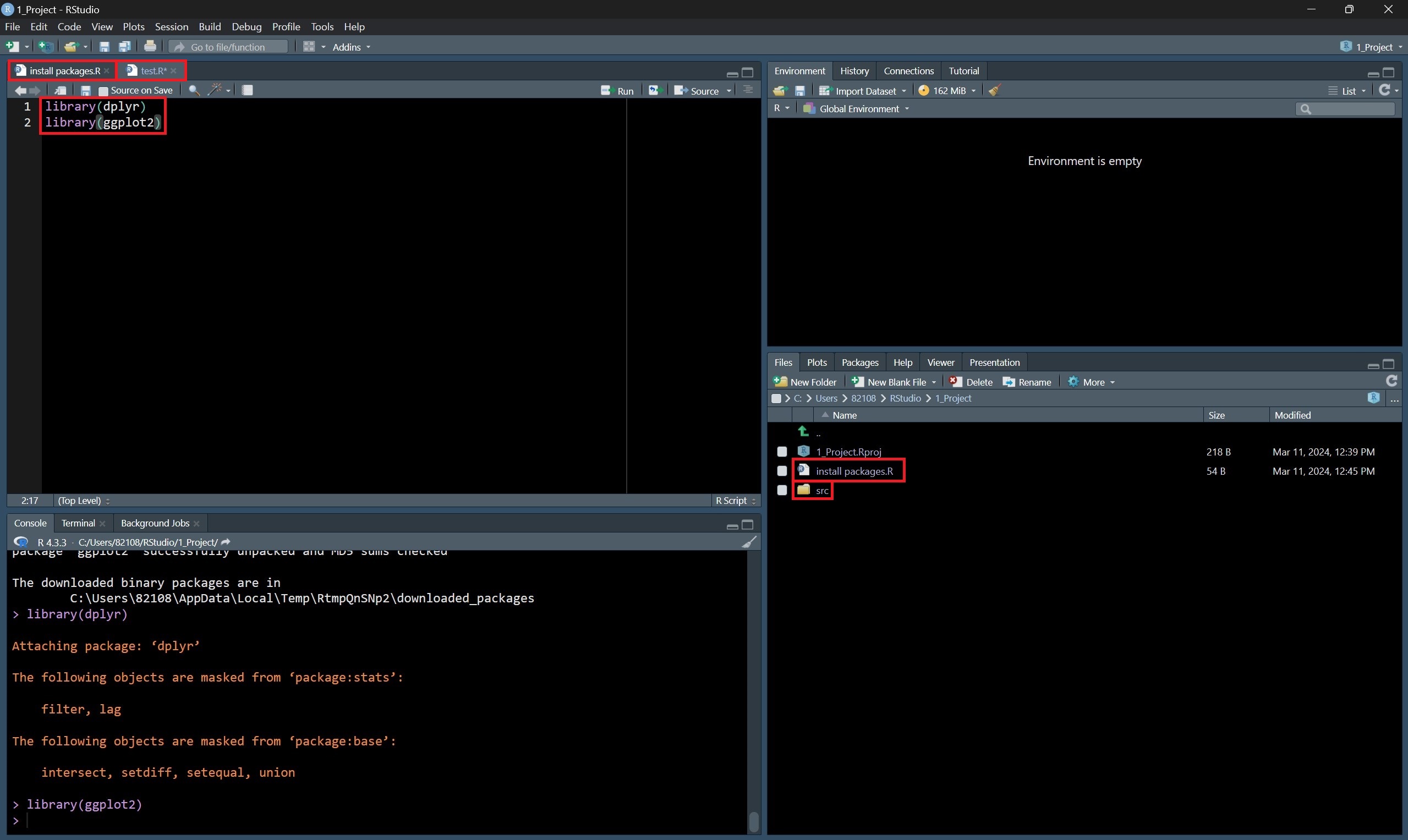 패키지를 설치할 때는 R 스크립트 파일을 새로 생성하여 해당 편집 창에 패키지를 설치하는 명령문을 입력하고 실행하면 해당 패키지가 설치된다.