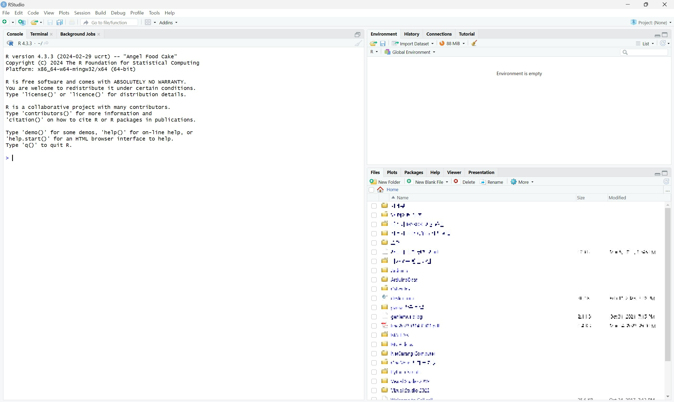 파일(Files) 창 : 도움말, 패키지 설치 및 조회, 그래프 실행 내용 조회 등 유용한 기능을 제공하는 영역