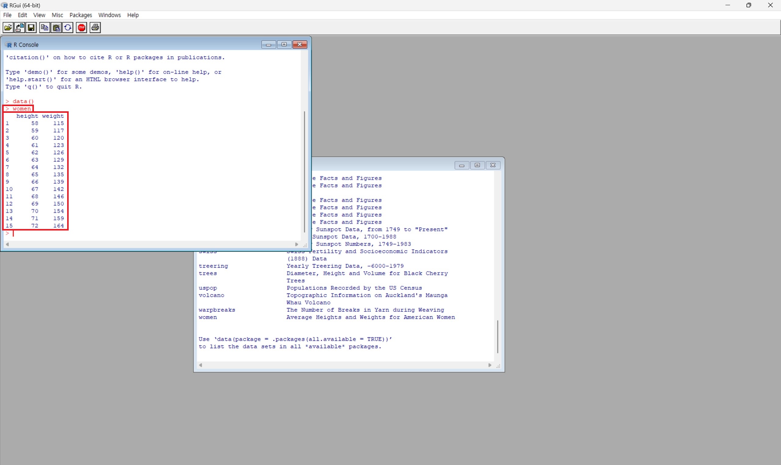 여기서 데이터 이름을 명령어로 간주하기 때문에 women 데이터 이름을 입력하면 women 데이터의 내용을 확인할 수 있다.