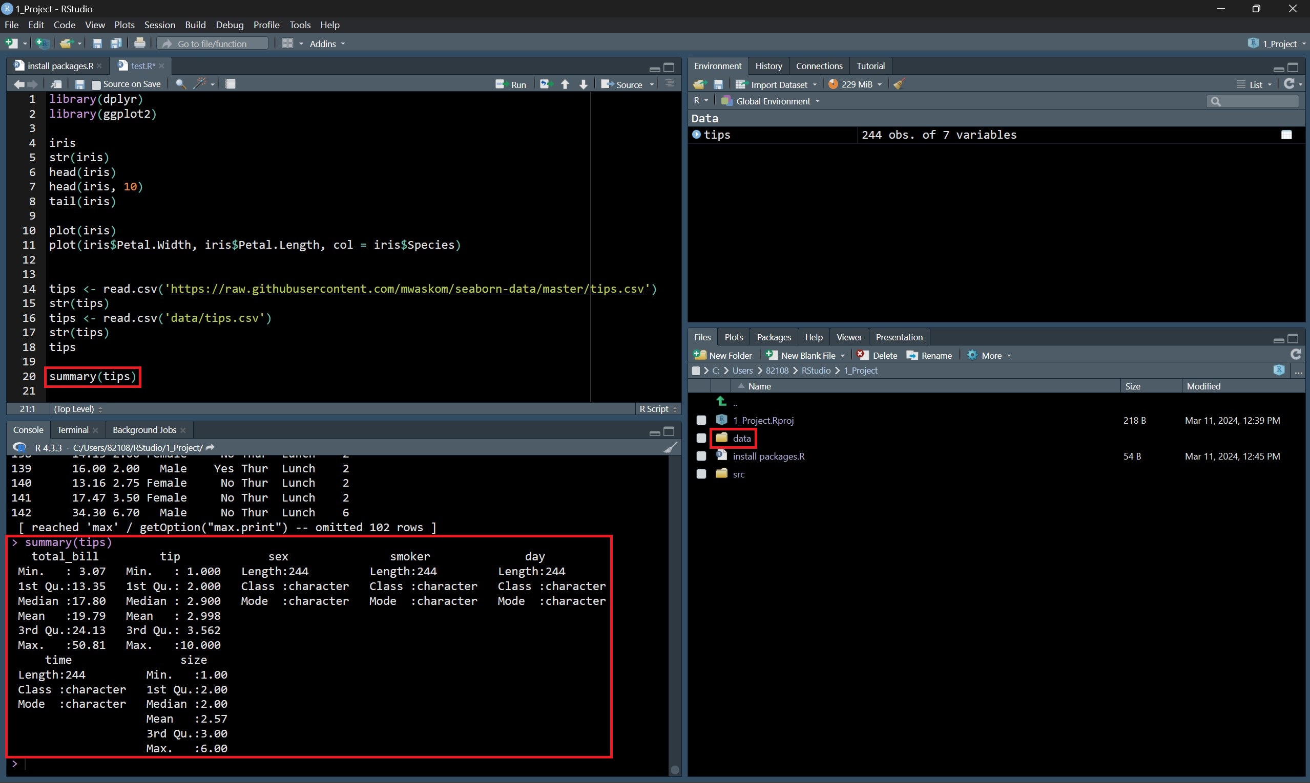 summary(tips) 명령문을 실행시켜 보면 각 열마다 요약 통계값을 확인할 수 있다.