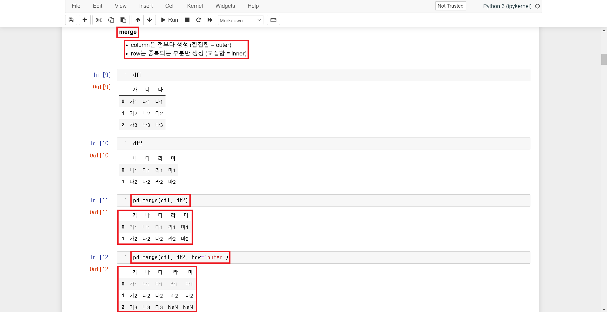 여기서 inner 설정을 how 옵션에서 outer로 바꾸게 되면 합집합으로 설정되게 됩니다.