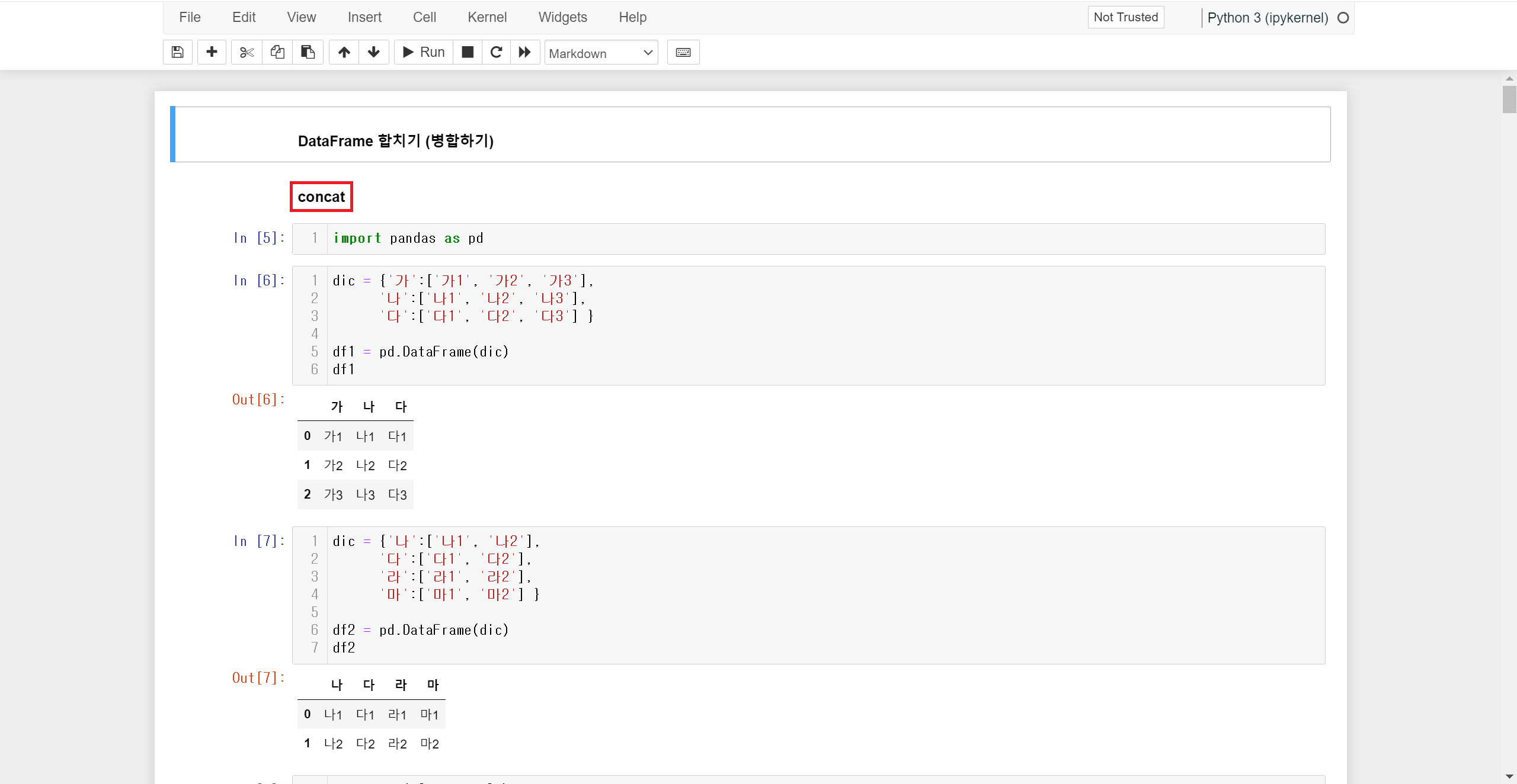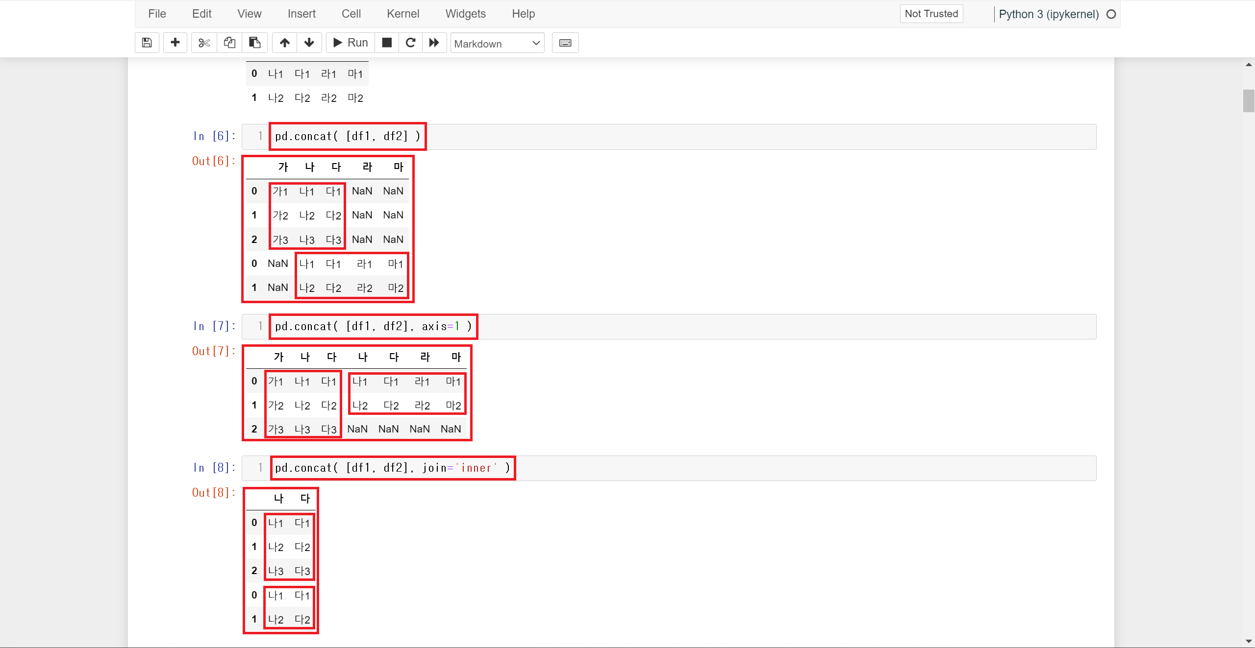 여러 데이터 프레임을 하나로 합치는 방법에는 여러 가지가 있는데 우선 concat을 살펴보면, concat은 단순하게 데이터 프레임들을 붙이는, 연결하는 방법입니다.