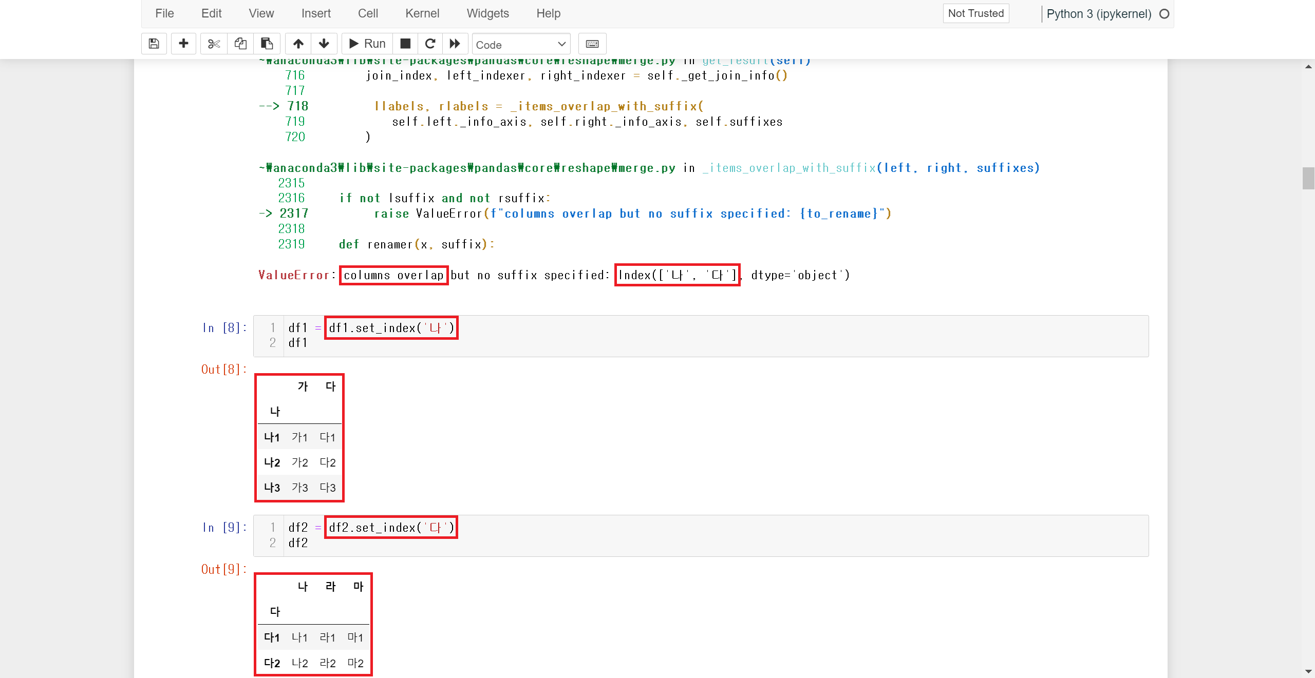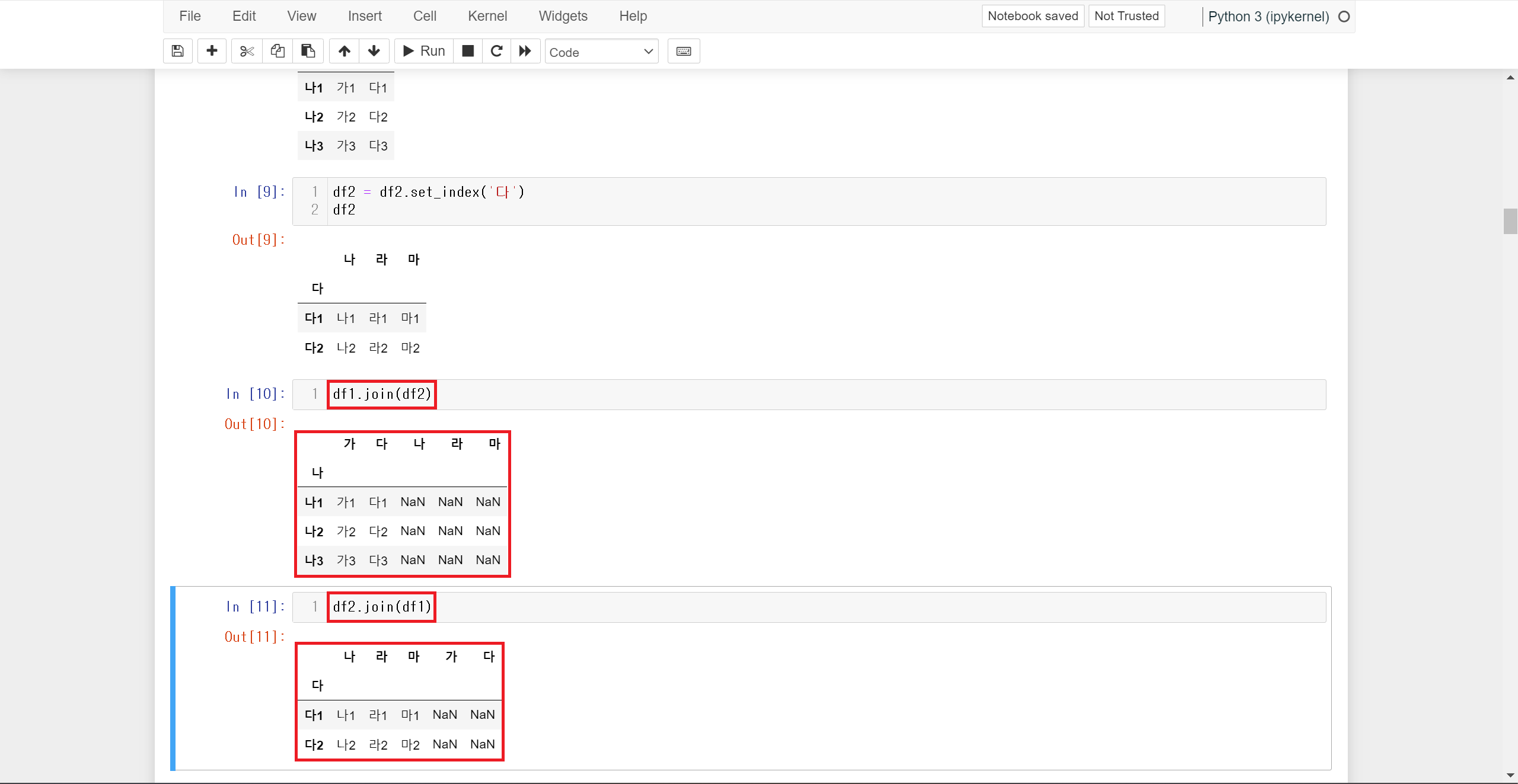 하여 첫 번째 데이터 프레임에서는 '나' 칼럼을 인덱스로 분리해 주고, 두 번째 데이터 프레임에서는 '다' 칼럼을 인덱스로 분리해 준 뒤에 join을 다시 진행해 보면 오류 없이 병합되는 것을 확인할 수 있습니다.