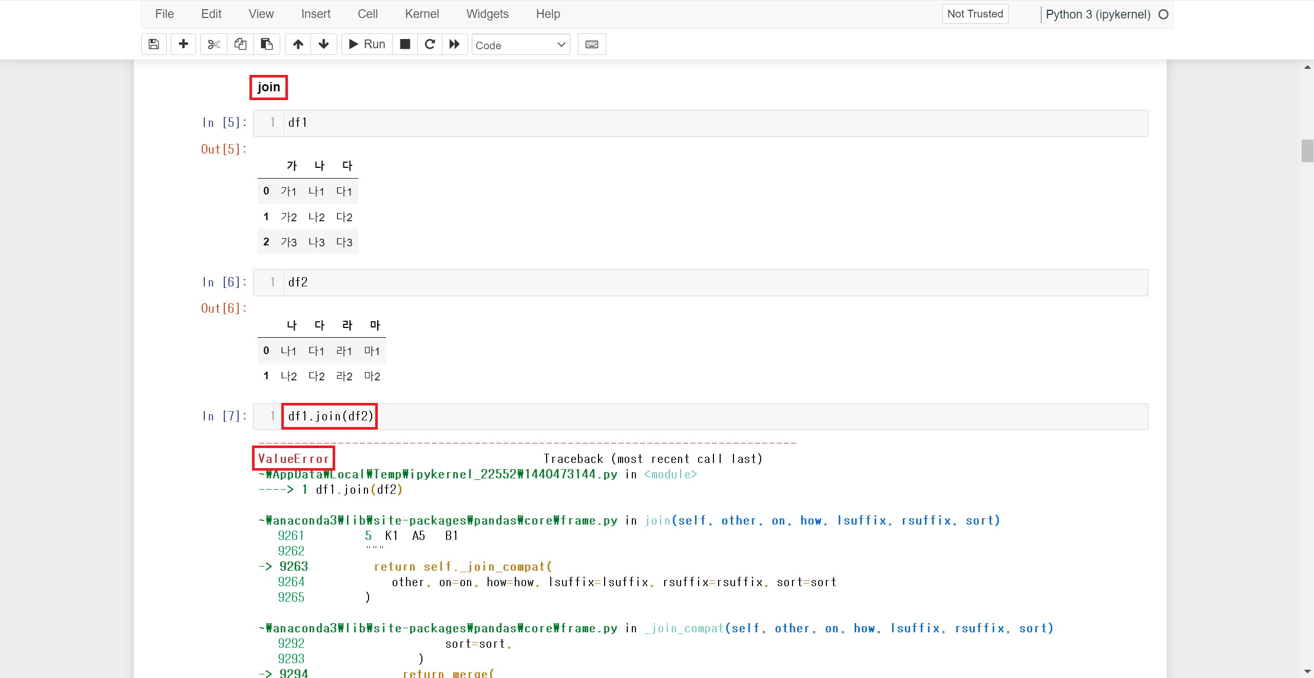join은 행의 인덱스를 기준으로 데이터 프레임이 병합되는데 칼럼이 중복되면 오류를 발생하게 됩니다.
