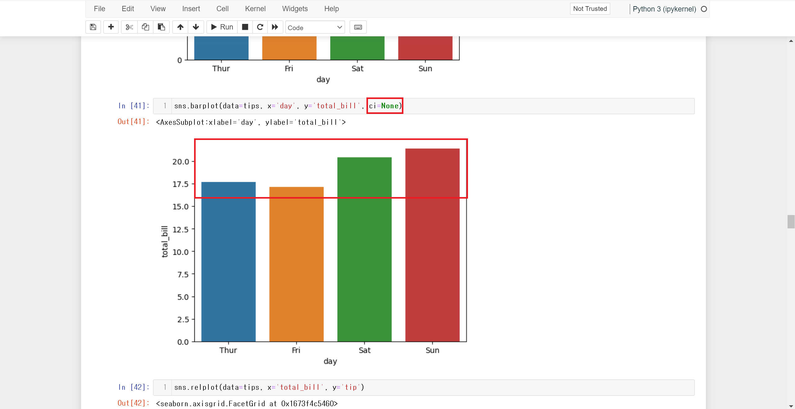 여기서 막대기는 분포를 나타내는데 막대기를 삭제하려면 barplot() 함수의 ci 옵션을 None으로 주면 됩니다.