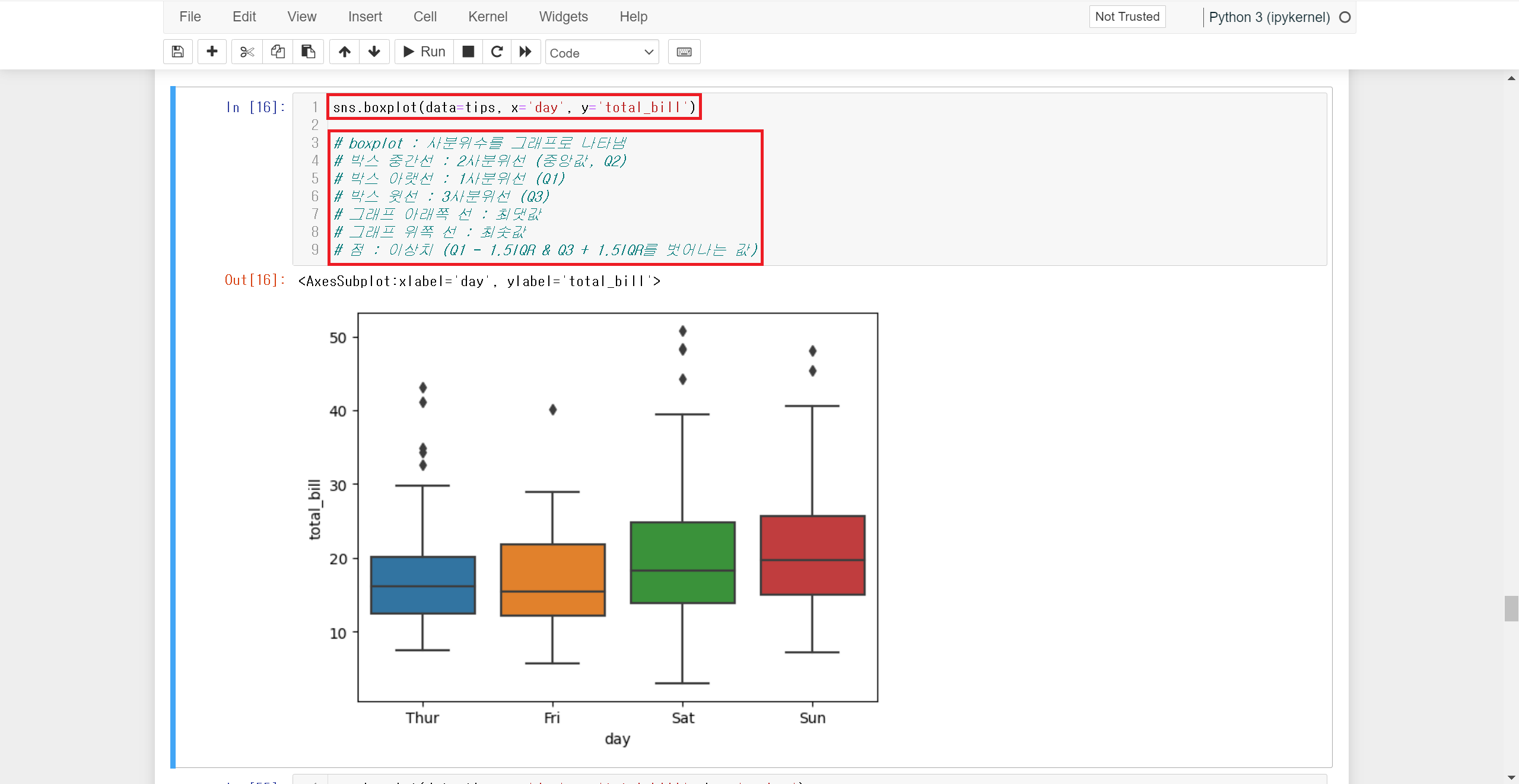 박스 밖의 수염과 이어진 선을 각 최소 범위(Q1 - 1.5 IQR)와 최대 범위(Q3 + 1.5 IQR)를 의미합니다.