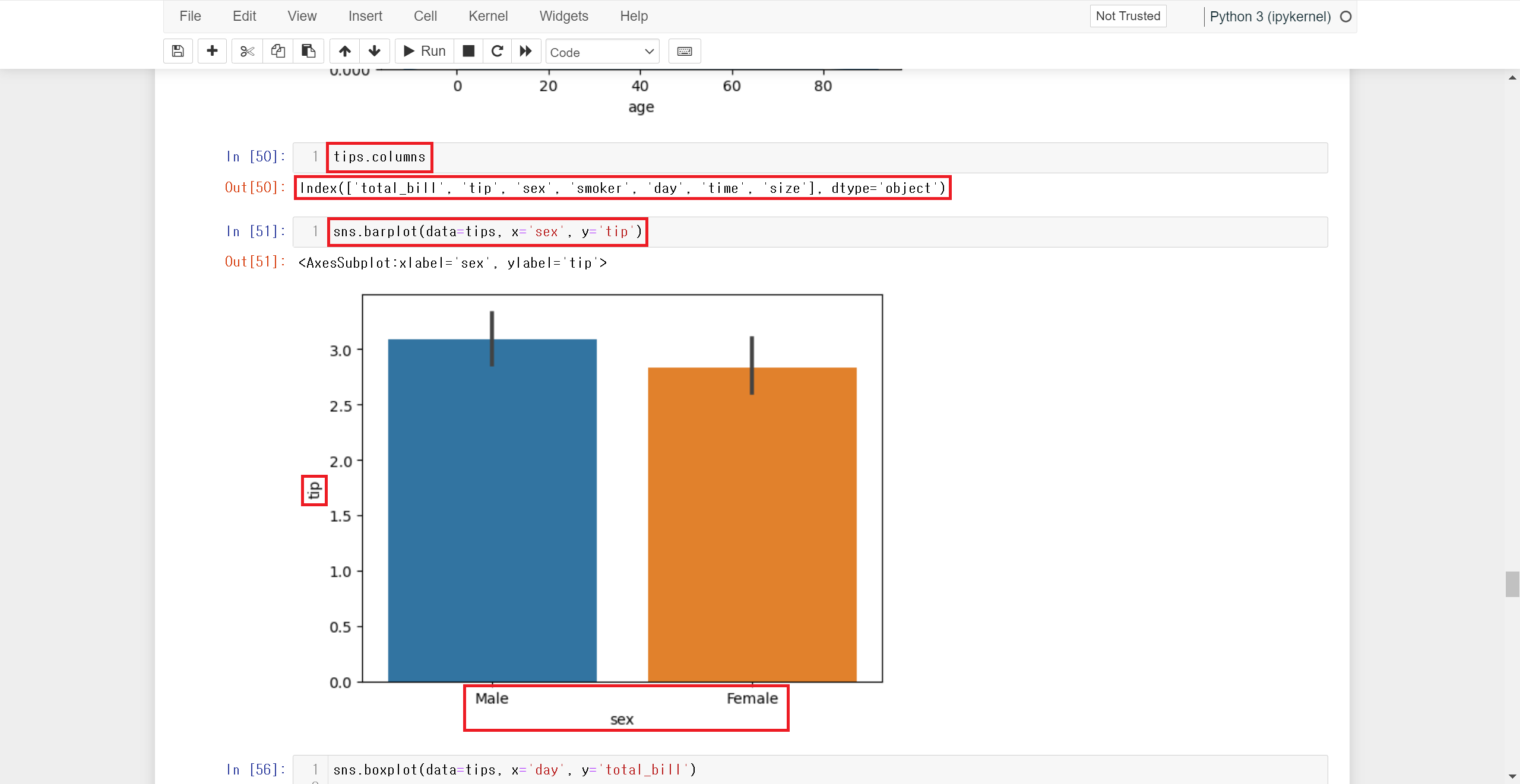 barplot() 함수를 사용하여 성별에 따른 tip의 금액을 그래프로 나타낼 수도 있습니다.