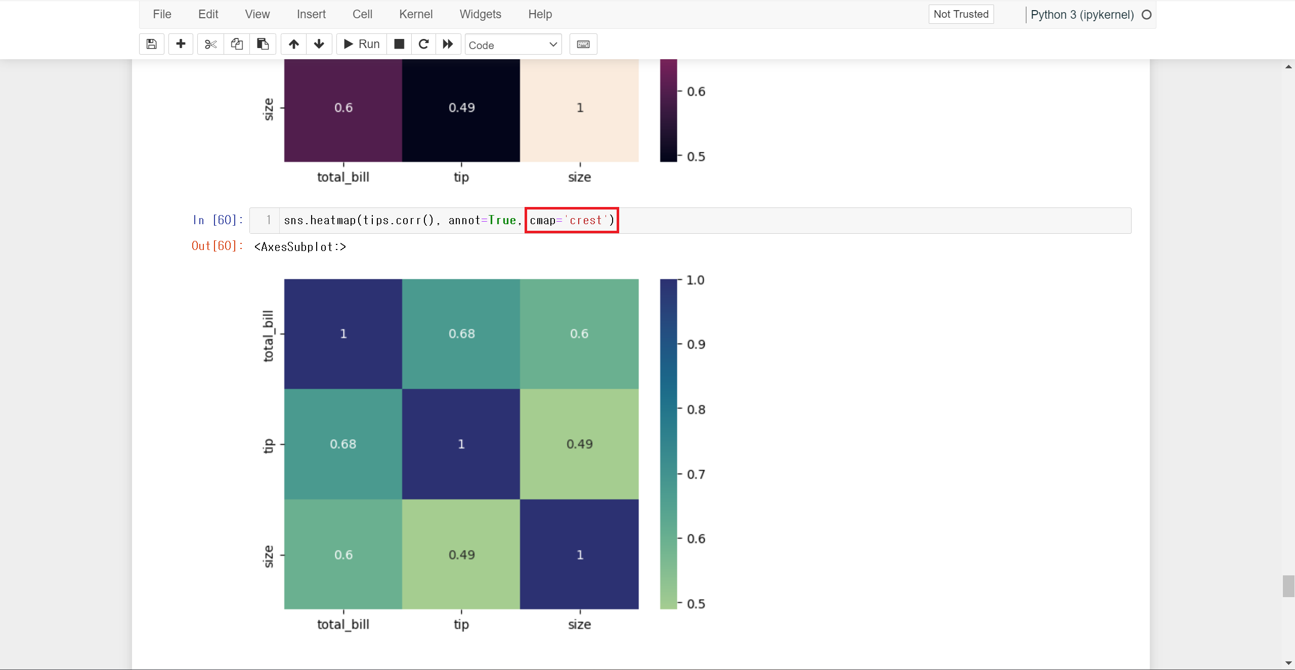 heatmap() 함수의 색을 변경할 수도 있는데, 색을 변경할 때는 cmap 옵션을 사용하면 됩니다.