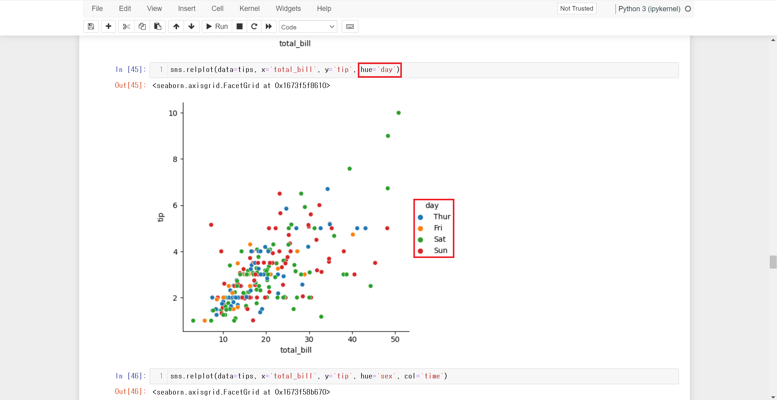 hue 옵션은 그래프에 색상을 적용하여 hue 옵션으로 지정해 준 column 값을 색상의 차이로 구별해 주는 옵션입니다.