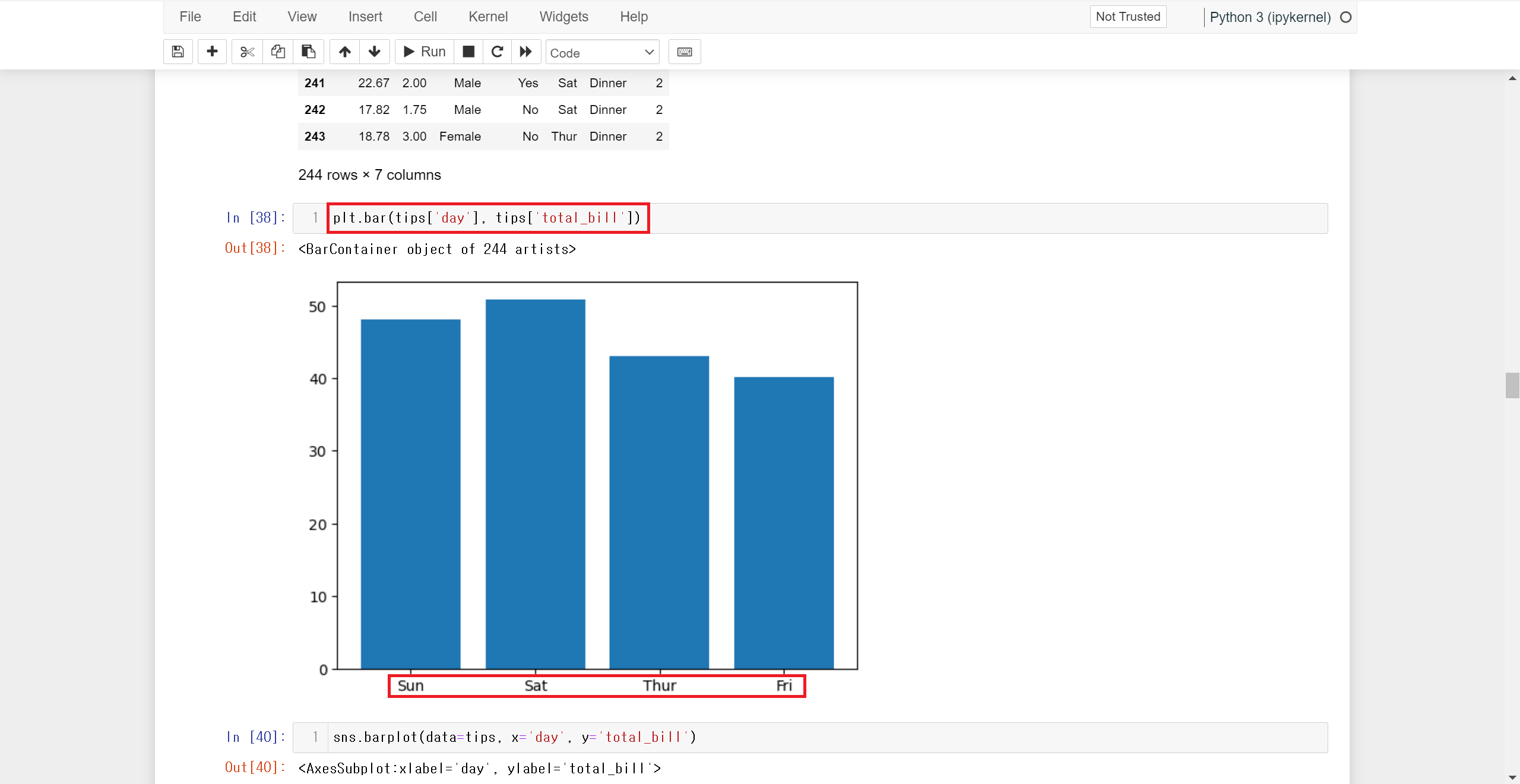 우선 seaborn 말고 matplotlib를 사용해 요일(day) 별로 요금(total_bill)을 막대그래프를 그려보면 주말이 평일보다 더 많은 것을 확인할 수 있습니다.