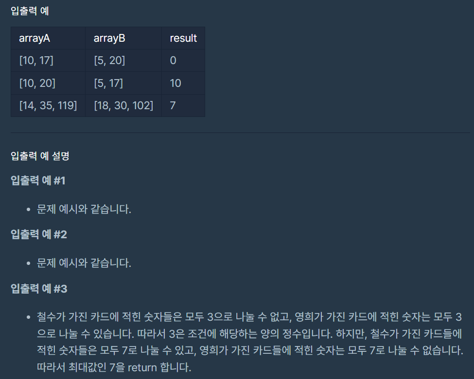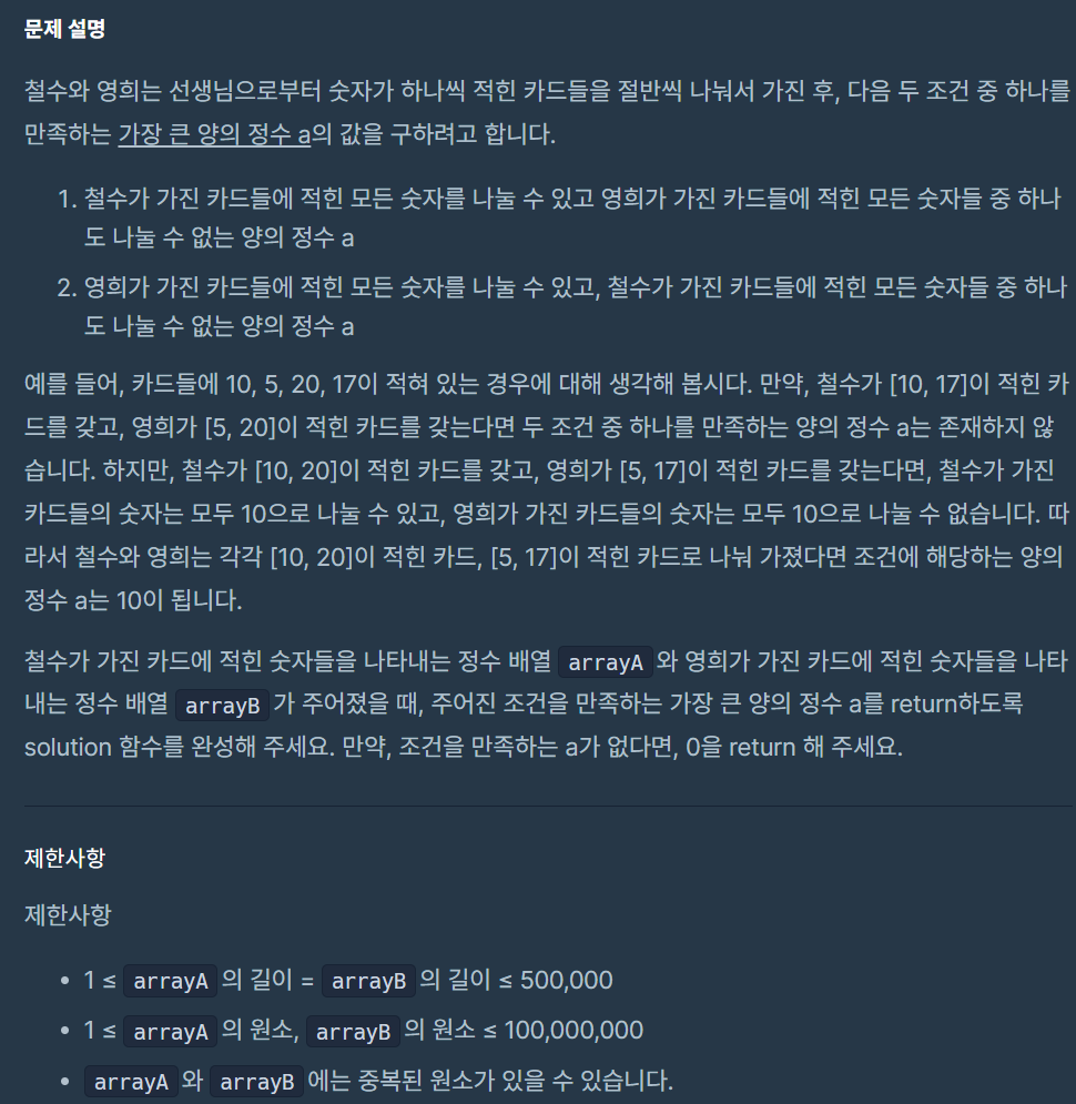 각 조건을 만족하는지 판별하는 방법은 각 카드 리스트의 최대 공약수를 구하여 구한 최대 공약수를 다른 리스트의 카드 값에 나누어 봤을 때 모두 나누어 떨어지지 않으면 된다.