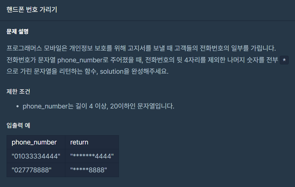 - 출력 결과에 해당 위치의 문자를 더한다. answer += phone_number[i]