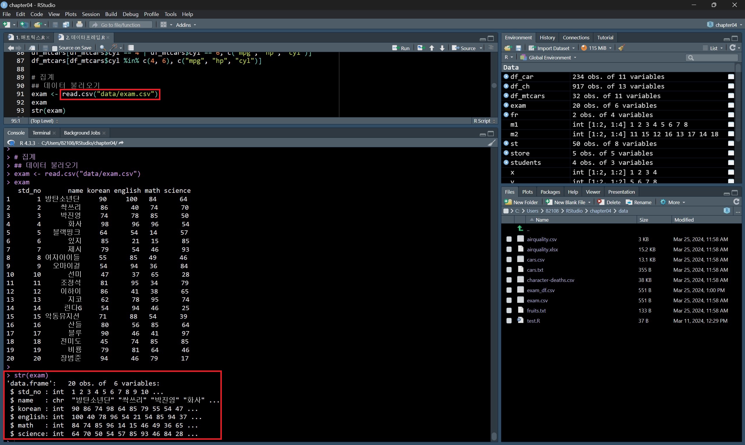 txt 파일은 read.table() 함수를 활용해 파일을 불러오고, csv 파일은 read.csv() 함수를 활용해 파일을 불러온다.