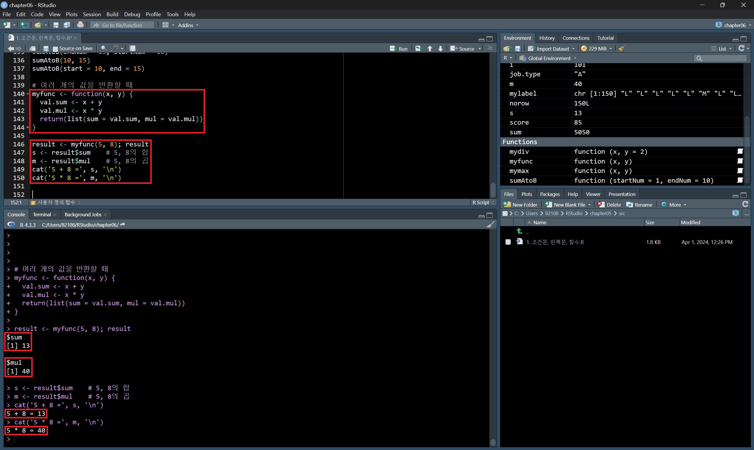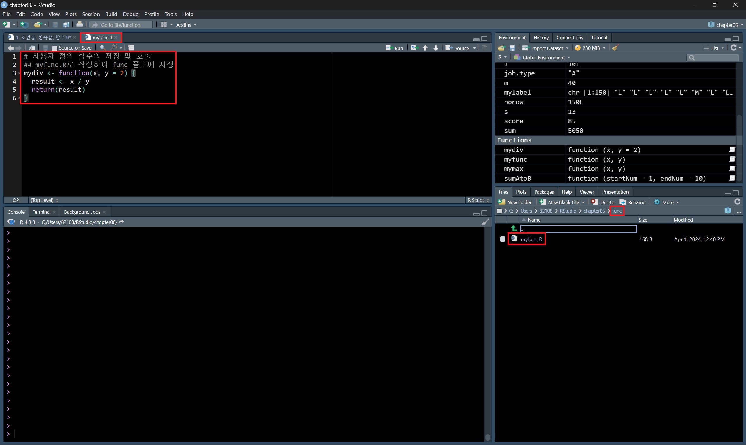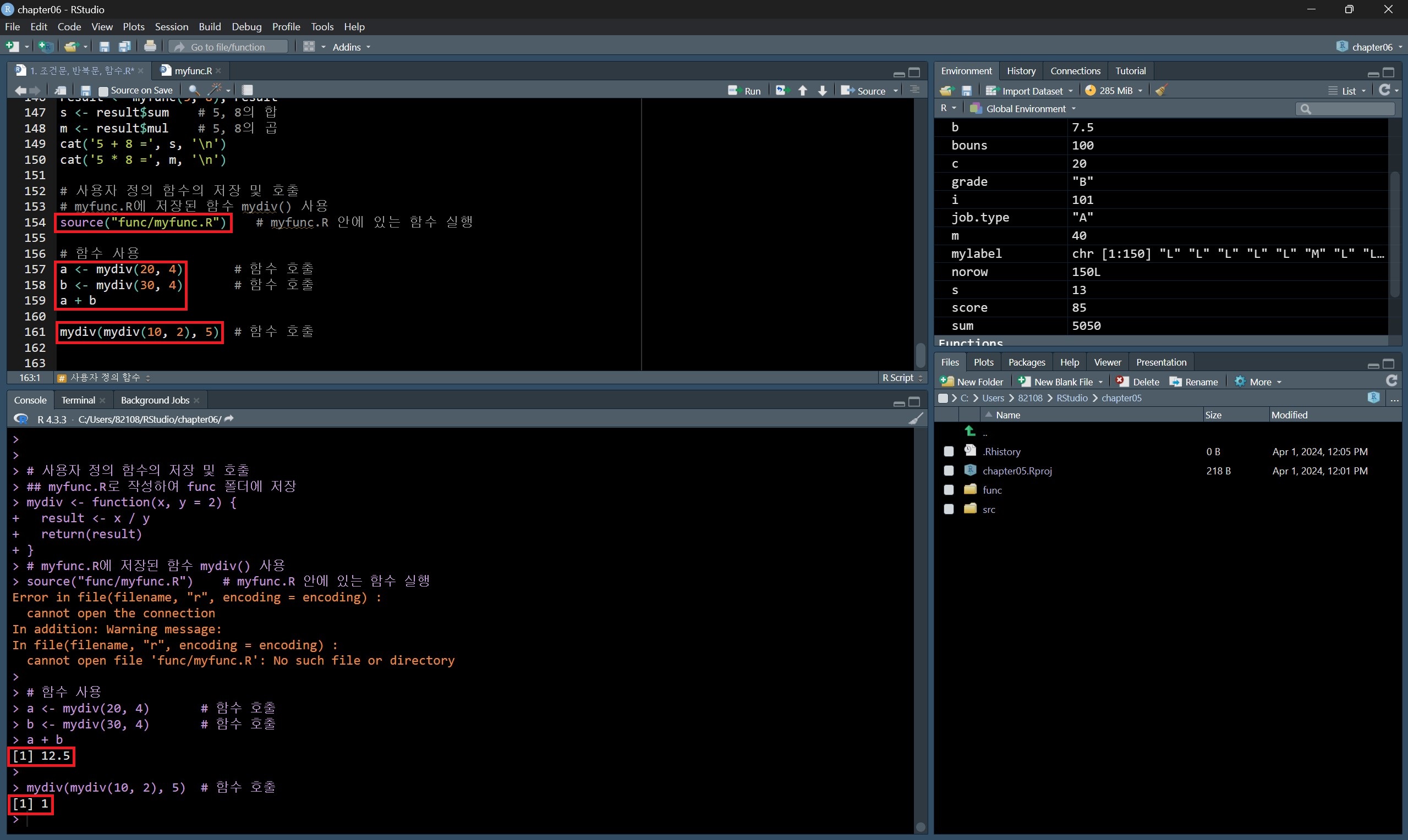 함수를 저장한 파일을 source() 함수에 넣어 해당 함수를 불러올 수 있고, 불러온 함수는 위에서 함수를 호출하는 방식으로 호출하여 사용하면 된다.