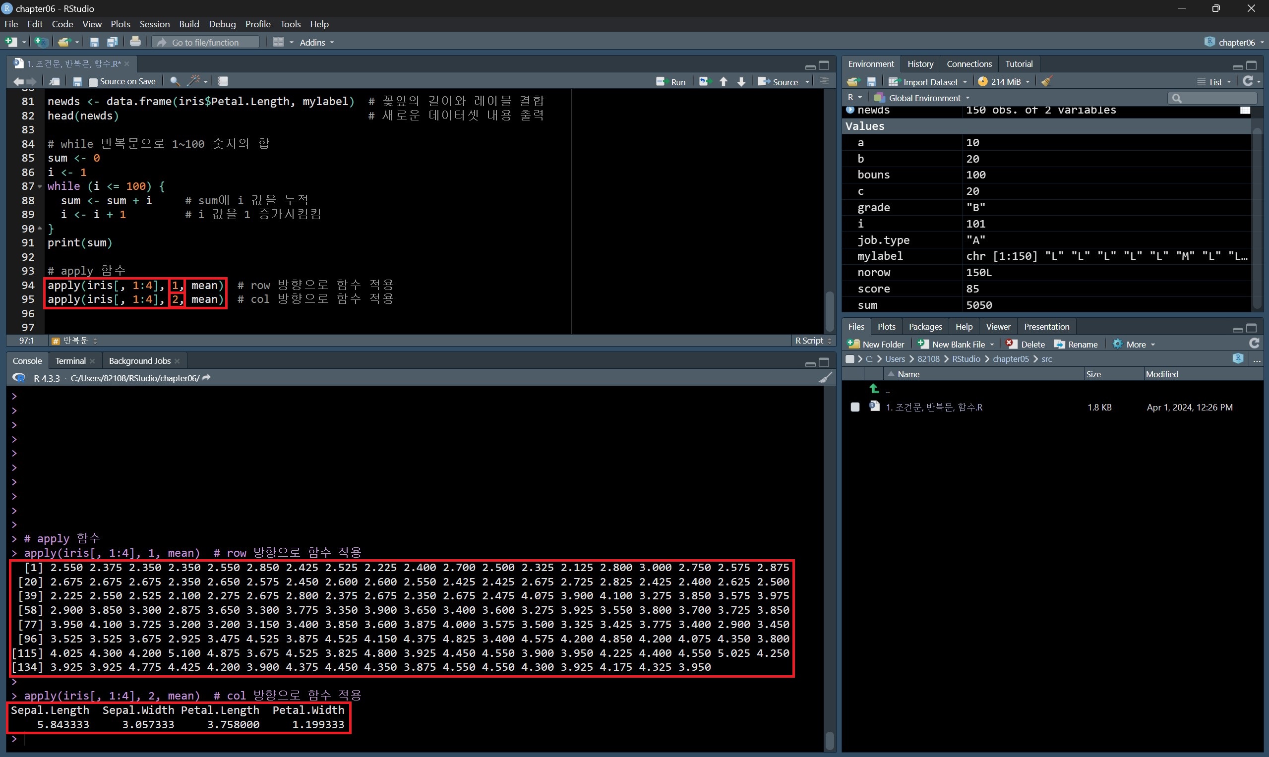 반복 작업이 필요한 경우 for 문과 while 문을 적용하는데, 그 반복 작업의 대상이 매트릭스나 데이터프레임의 행(row) 또는 열(column)인 경우 for 문과 while 문 대신에 apply() 함수를 이용할 수 있다.