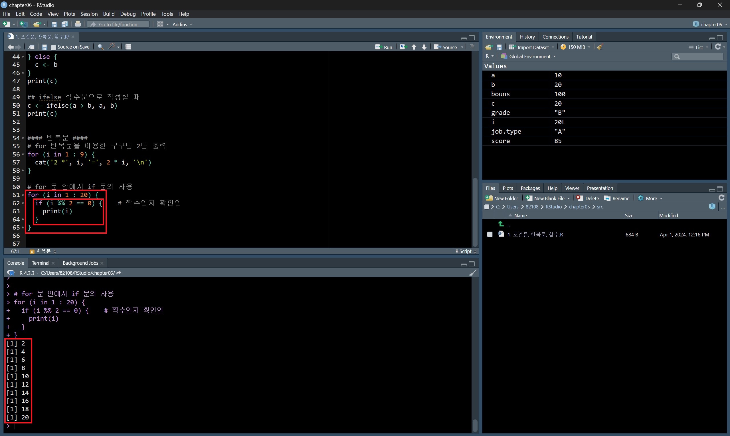반복문 안에 조건문을 사용하여 원하는 반복 변수의 값만을 추출할 수도 있다.
