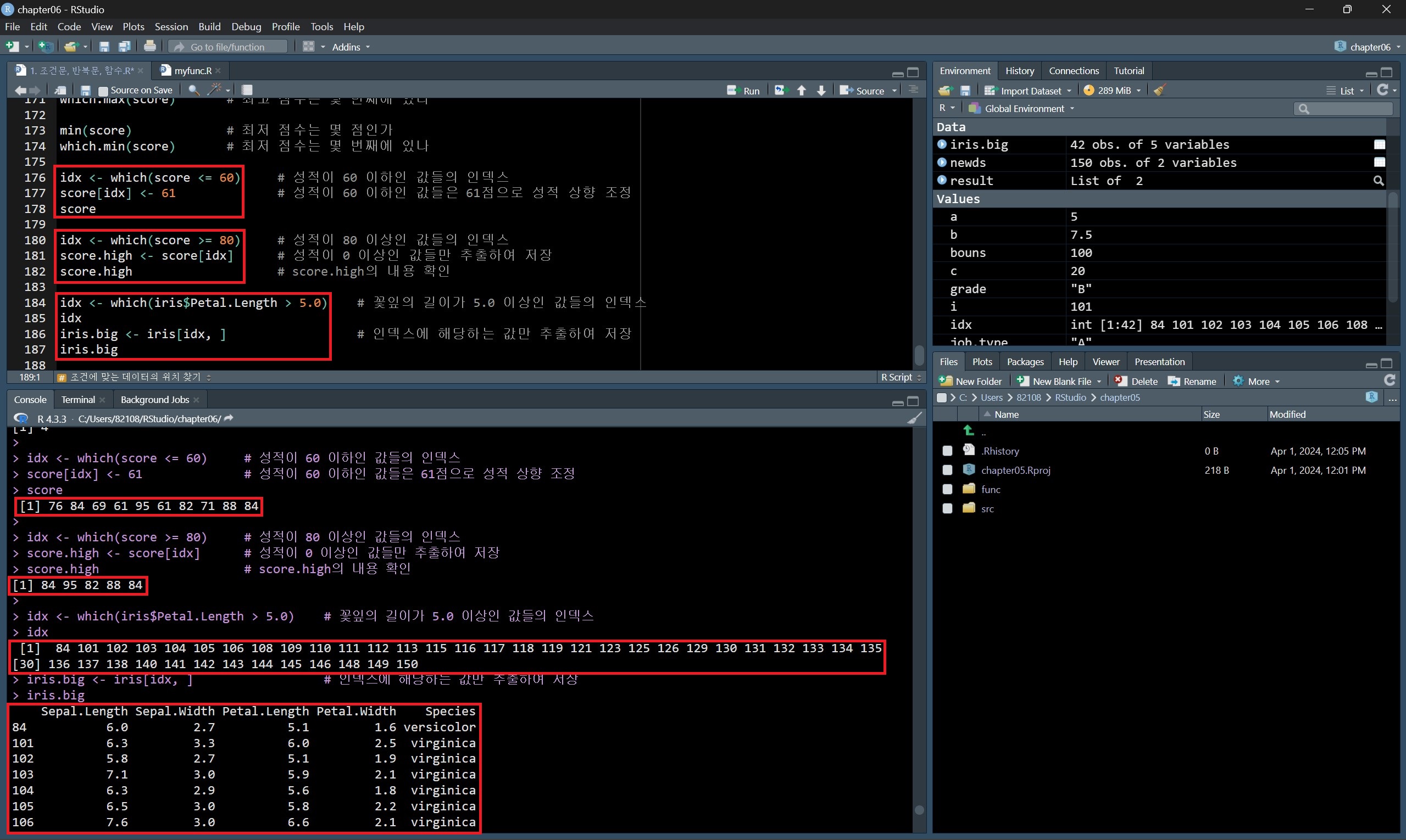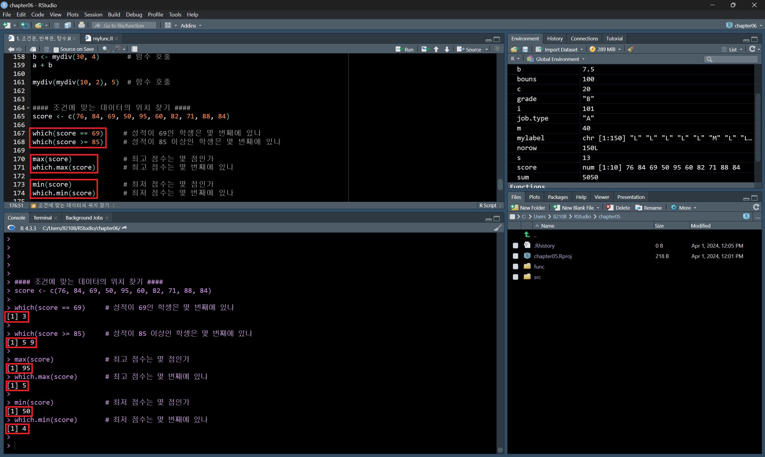 which() 함수는 데이터의 위치를 반환해 주는 함수인데, which() 함수 안에 조건을 넣으면 해당 조건을 만족하는 값의 위치를 반환해 준다.