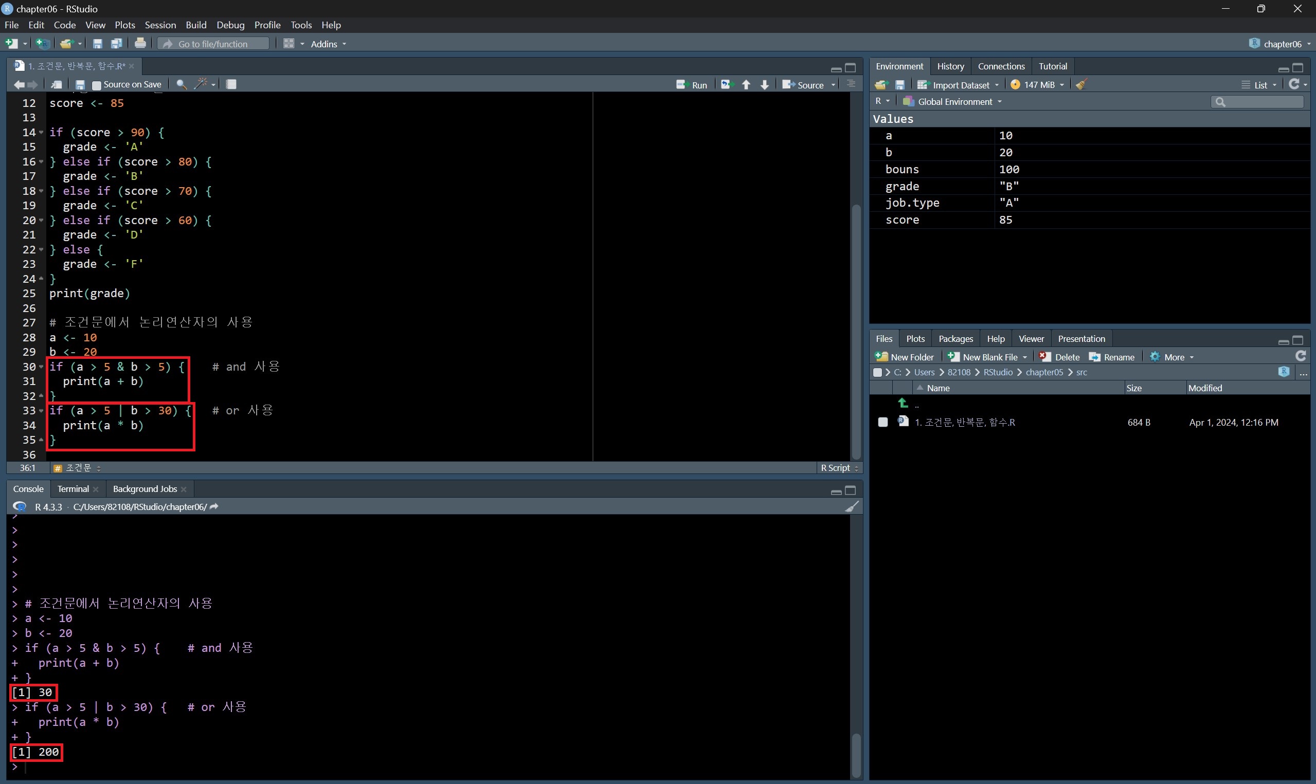 and 연산자인 &와 or 연산자인 |를 사용하여 조건에 논리연산자를 사용할 수 있다.