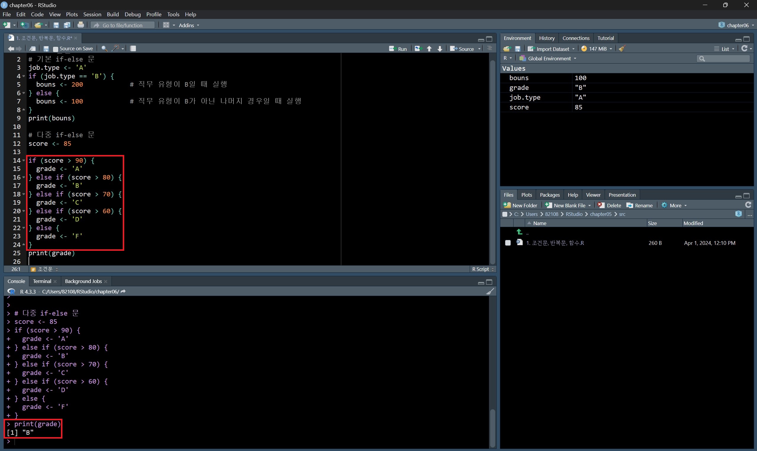 그러면 if 문부터 차례대로 조건을 판별하며 맞는 조건을 찾아 명령문을 실행하고 만약 맞는 조건이 없으면 else 문의 명령문을 실행한다.