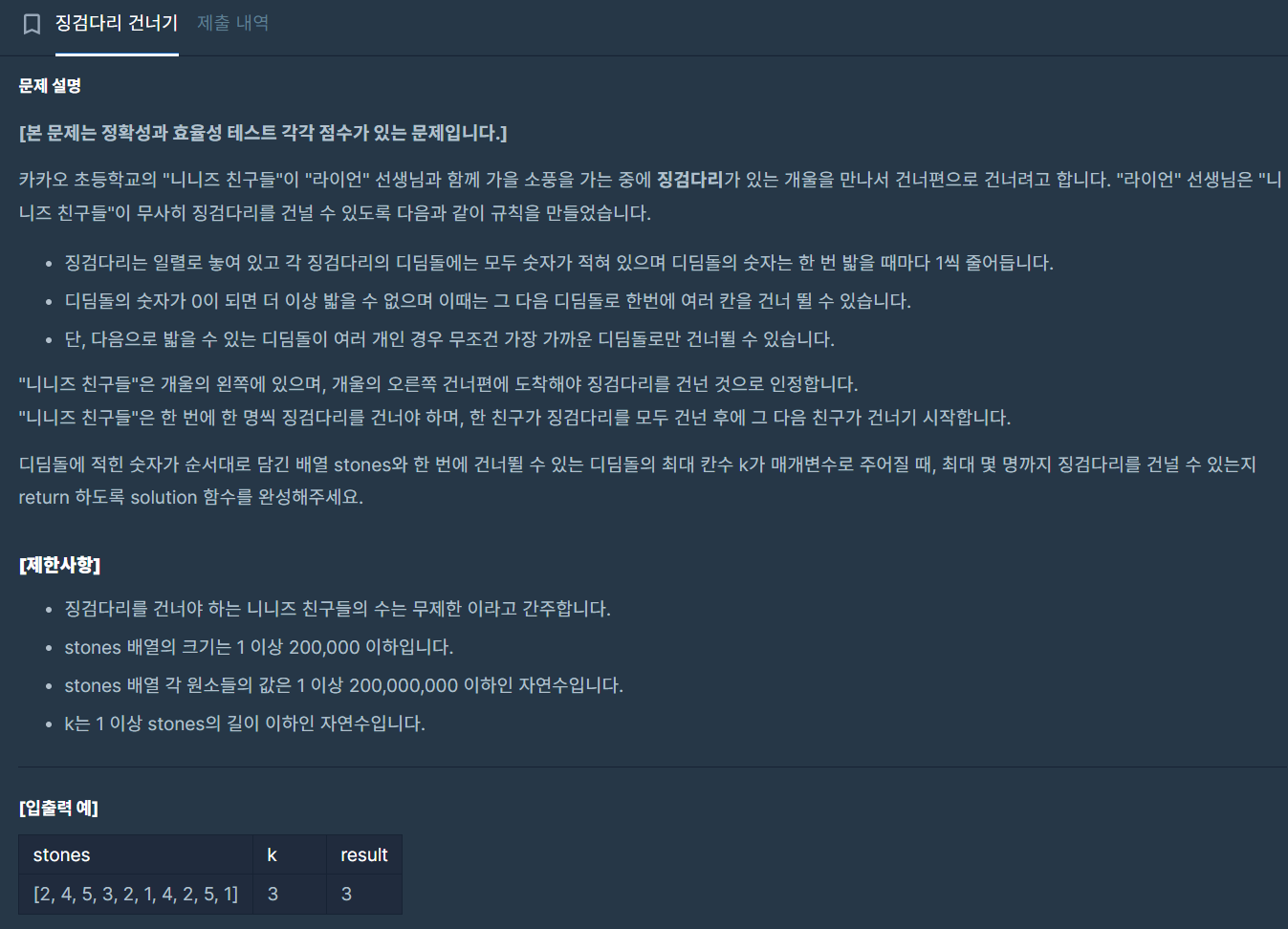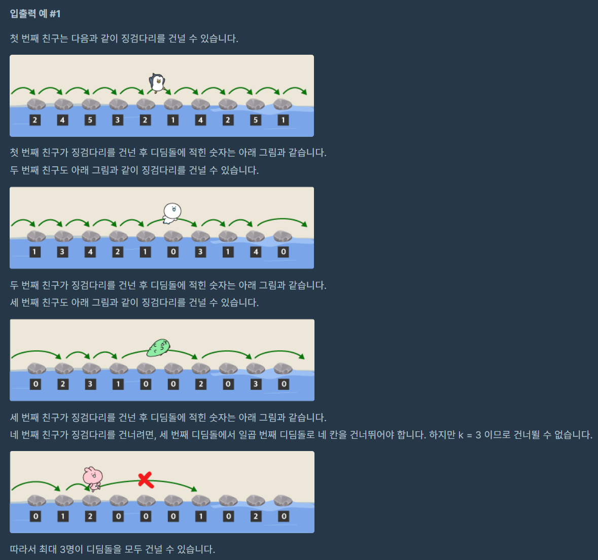 - 만약 현재 디딤돌을 가능한 모두 밟아 디딤돌이 제거되었을 때, 다음 디딤돌과 이전 디딤돌의 거리를 확인하여 건널 수 있는 최대 가능거리인 K보다 크면 if (next_idx[index] - pre_idx[index] > k)