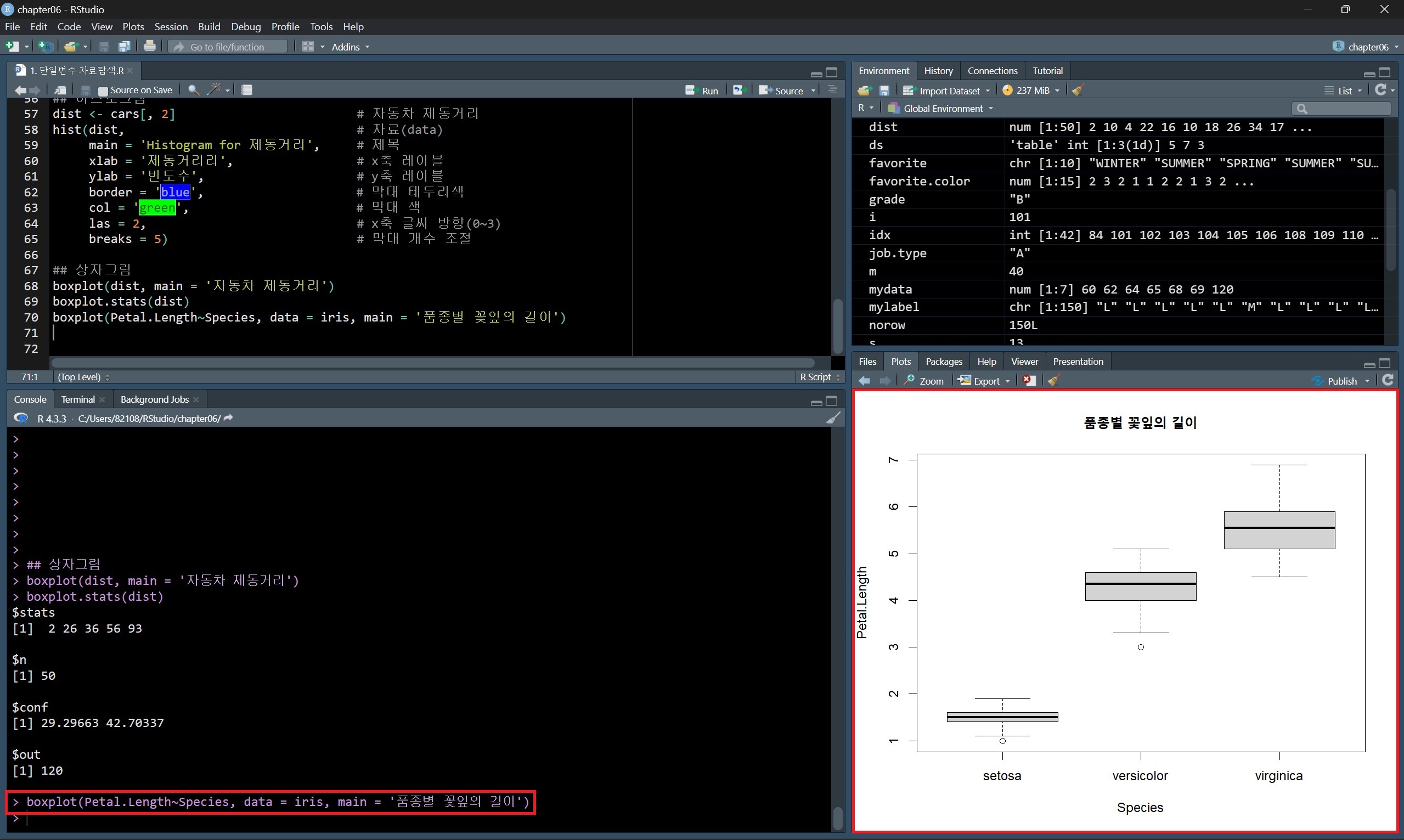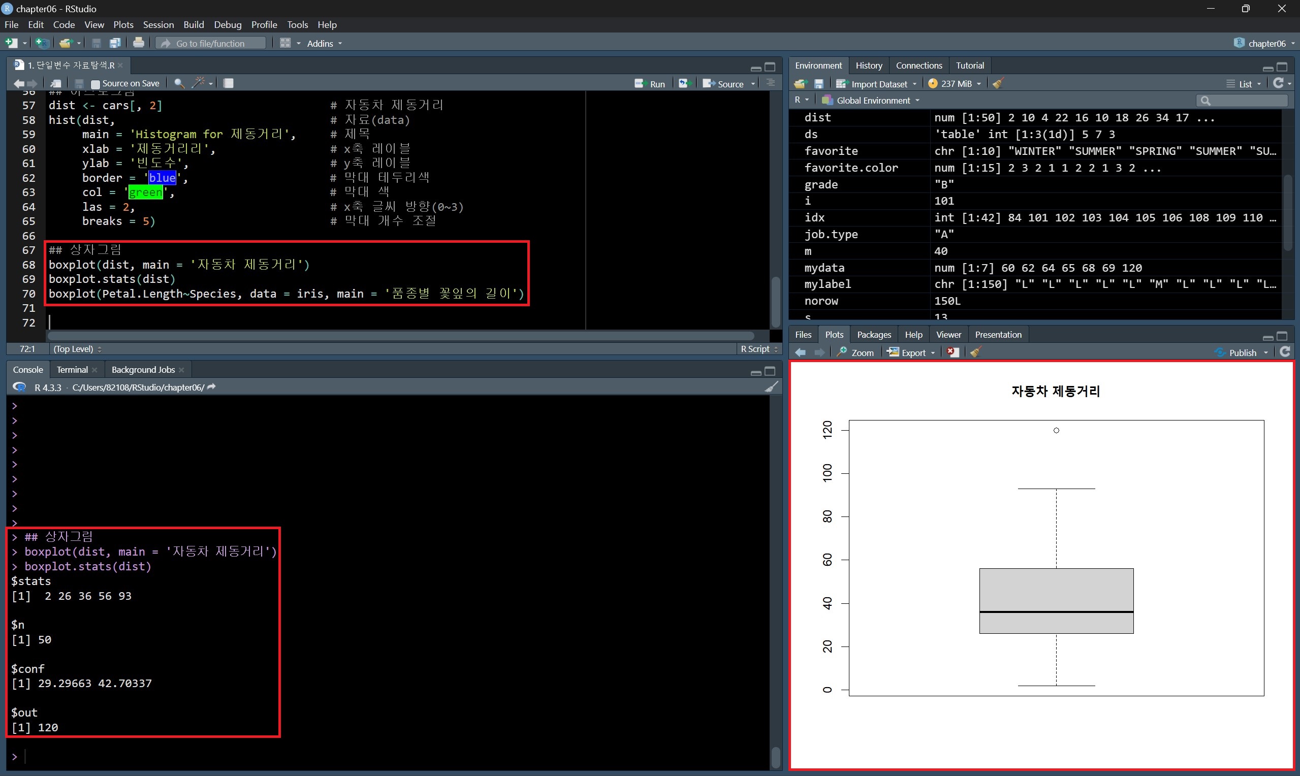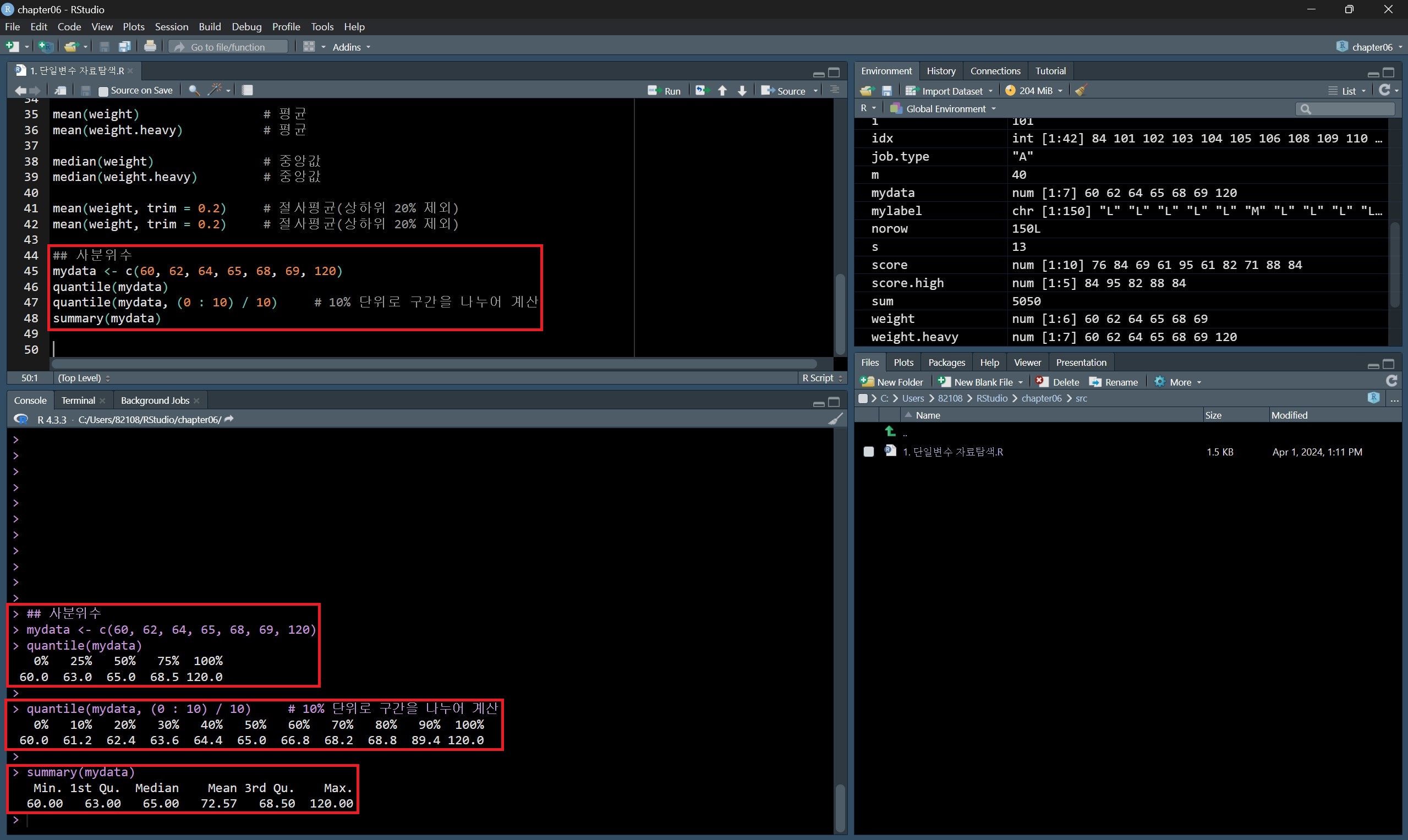 그리고 quantile() 함수와 요약 통계 정보를 나타내는 summary() 함수의 결과를 비교해 보면, summary() 함수의 결과에는 최솟값과 최댓값, 평균이 포함되어 있는 것을 확인할 수 있다.