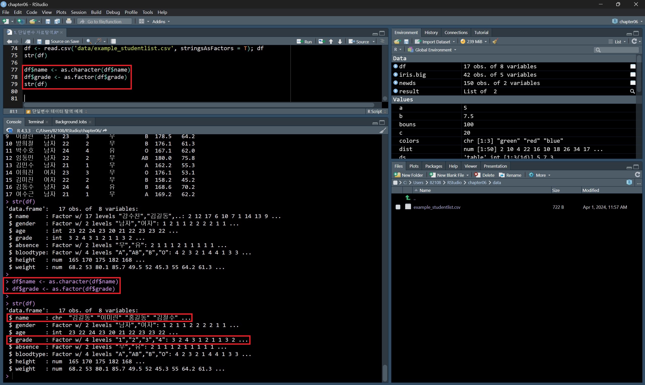 변경한 후 str() 함수로 다시 데이터를 살펴보면 각 name 변수와 gender 변수의 자료형태가 바뀐 것을 확인할 수 있다.