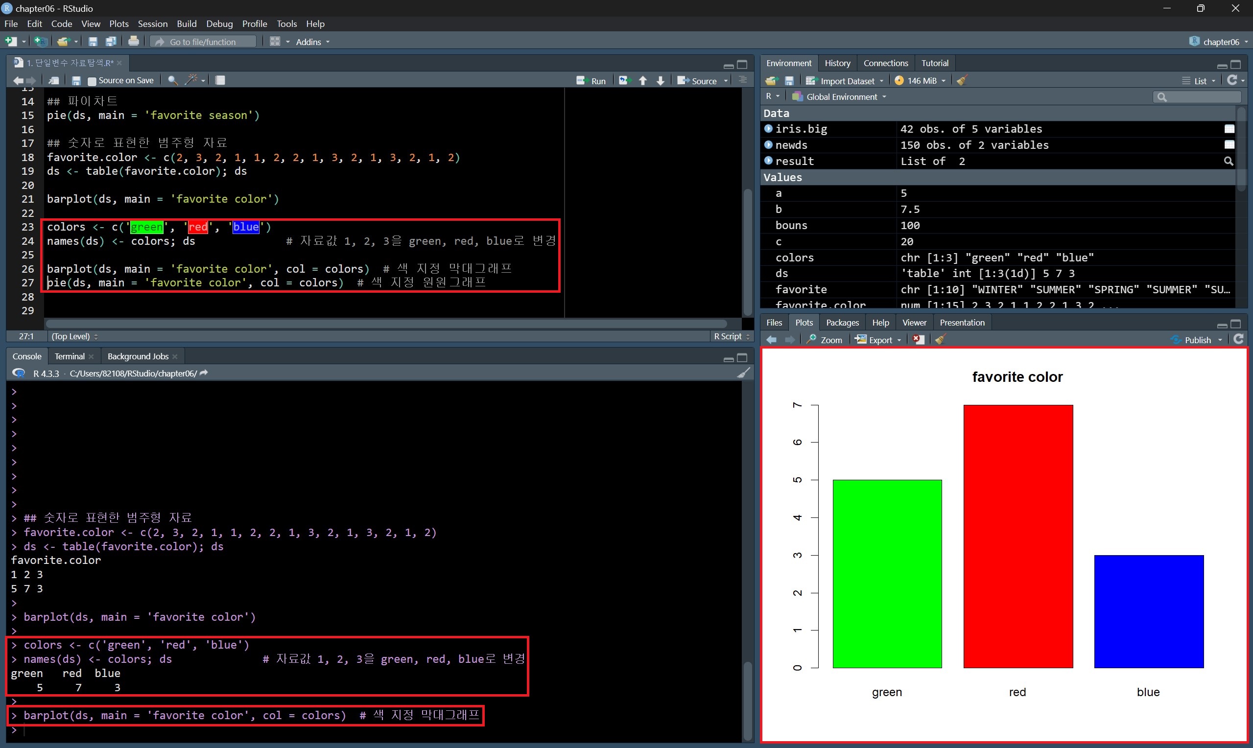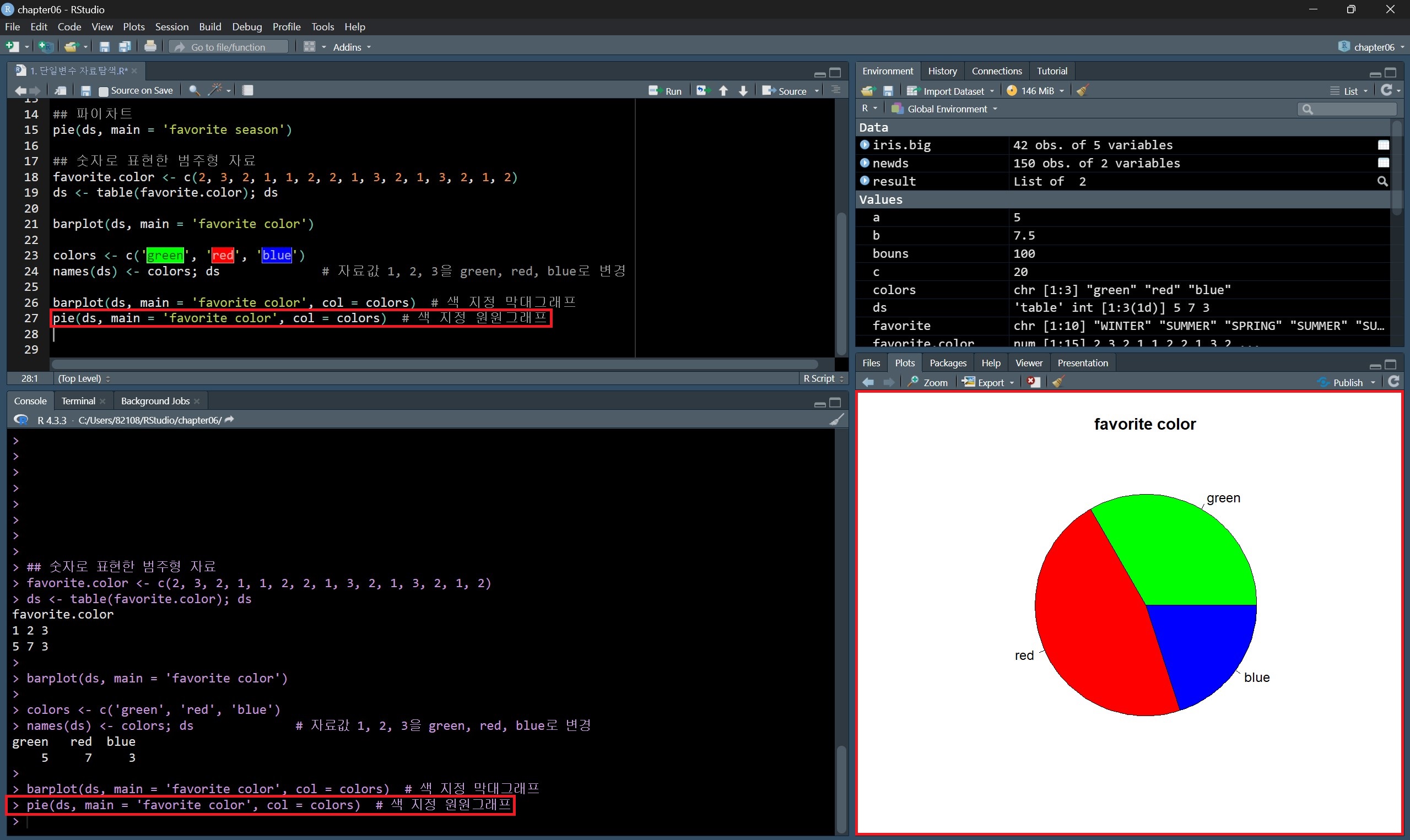 숫자로 된 범주형 자료를 각 데이터 종류별 숫자를 색상으로 지정하여 종류별로 색상이 다른 막대그래프와 원 그래프를 그릴 수 있다.