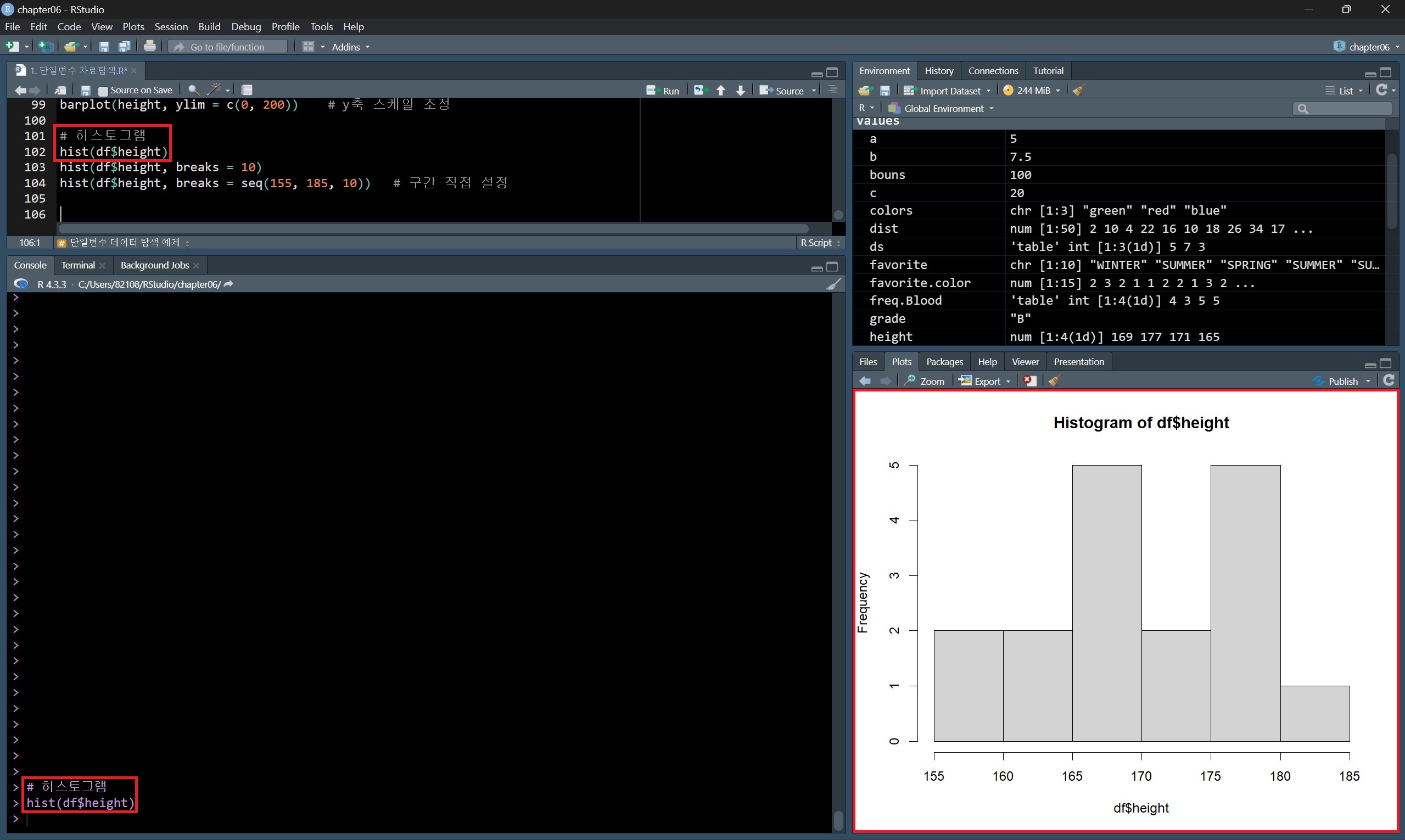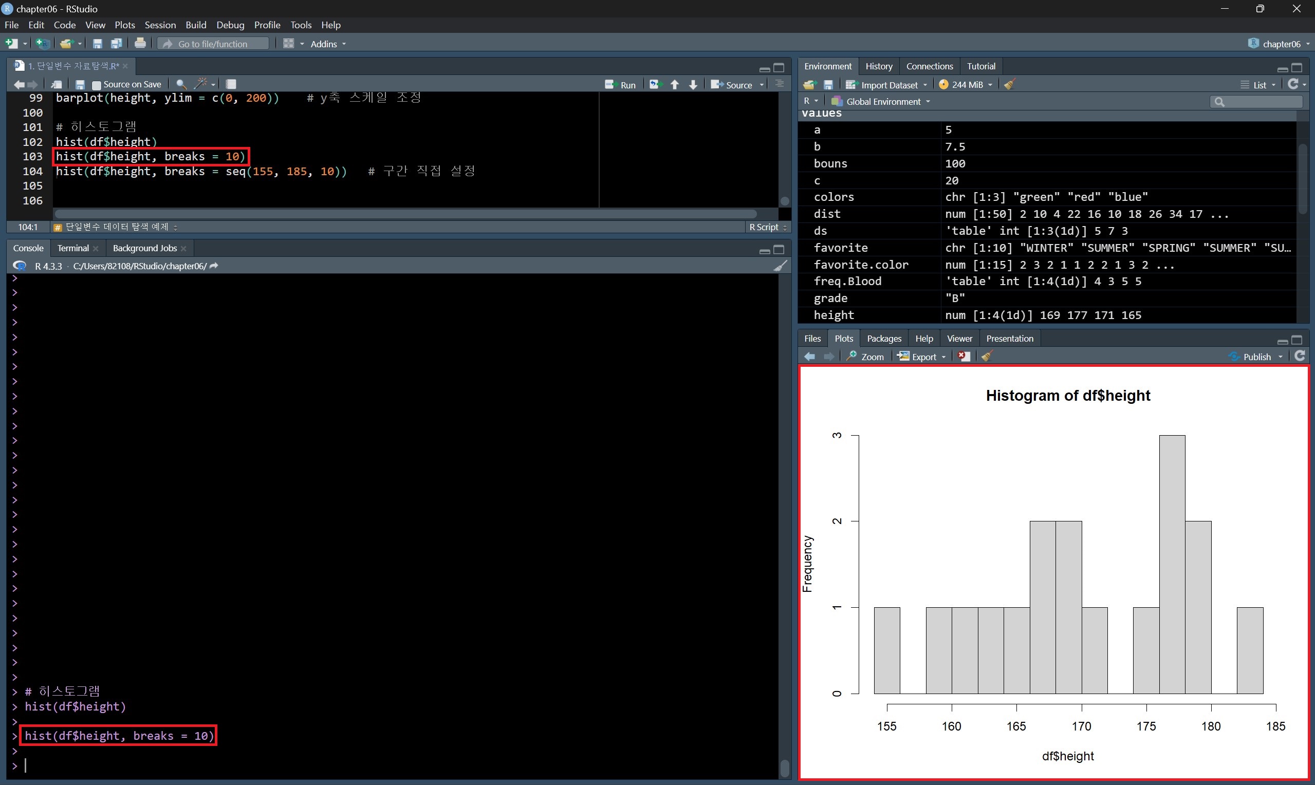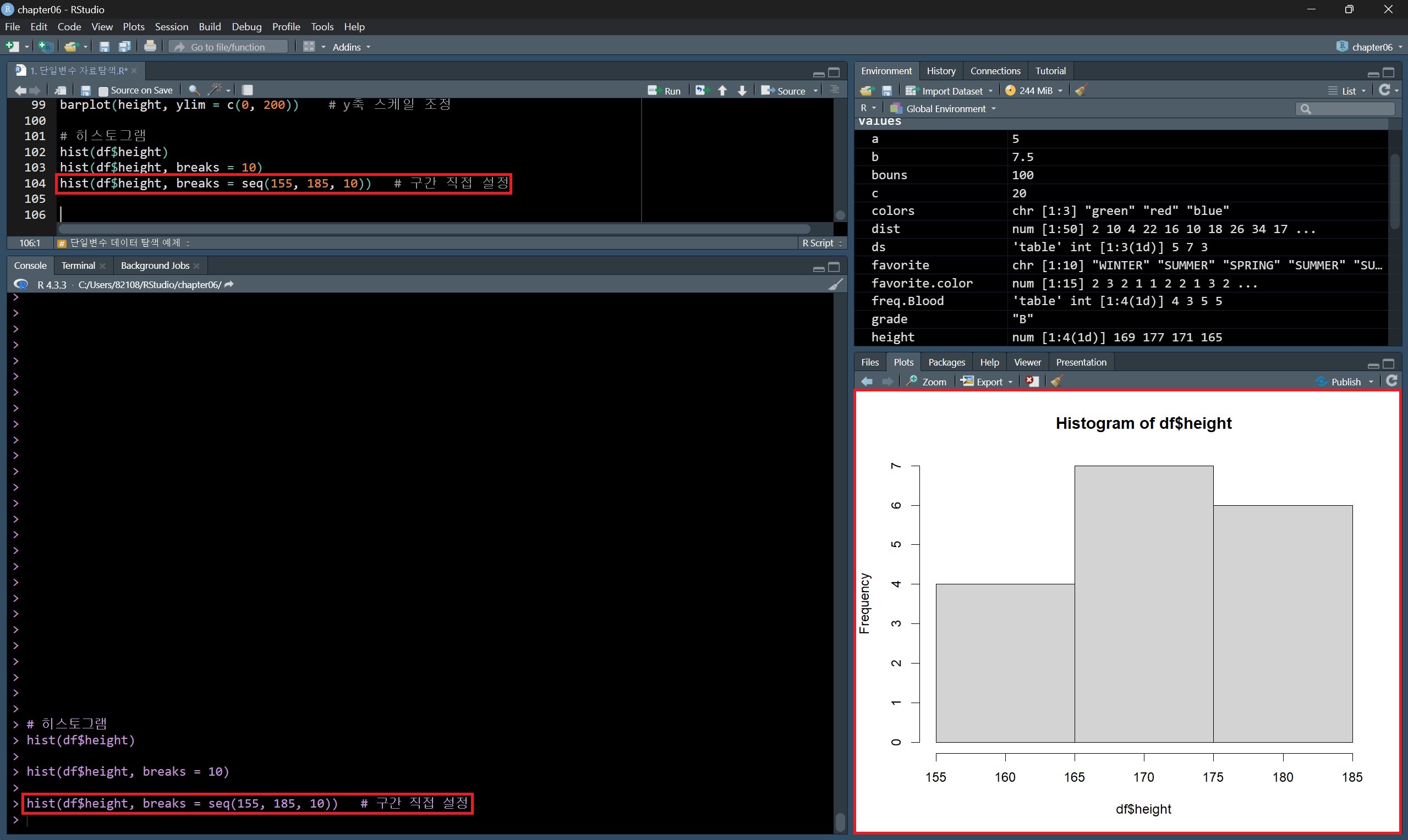 히스토그램을 그릴 때 breaks 매개변수를 지정했는데, 이는 데이터를 나눌 구분 값을 지정하는 것이다.