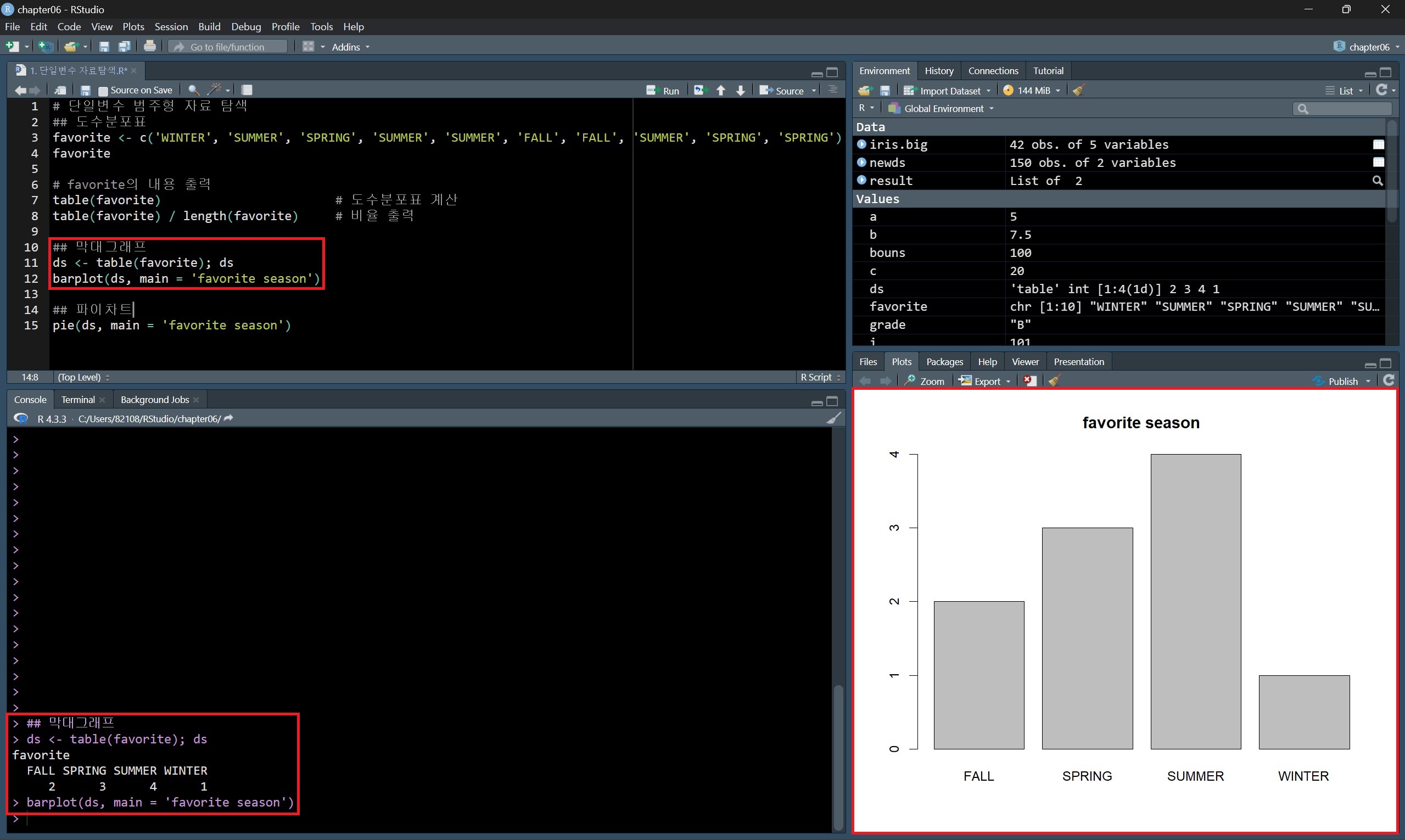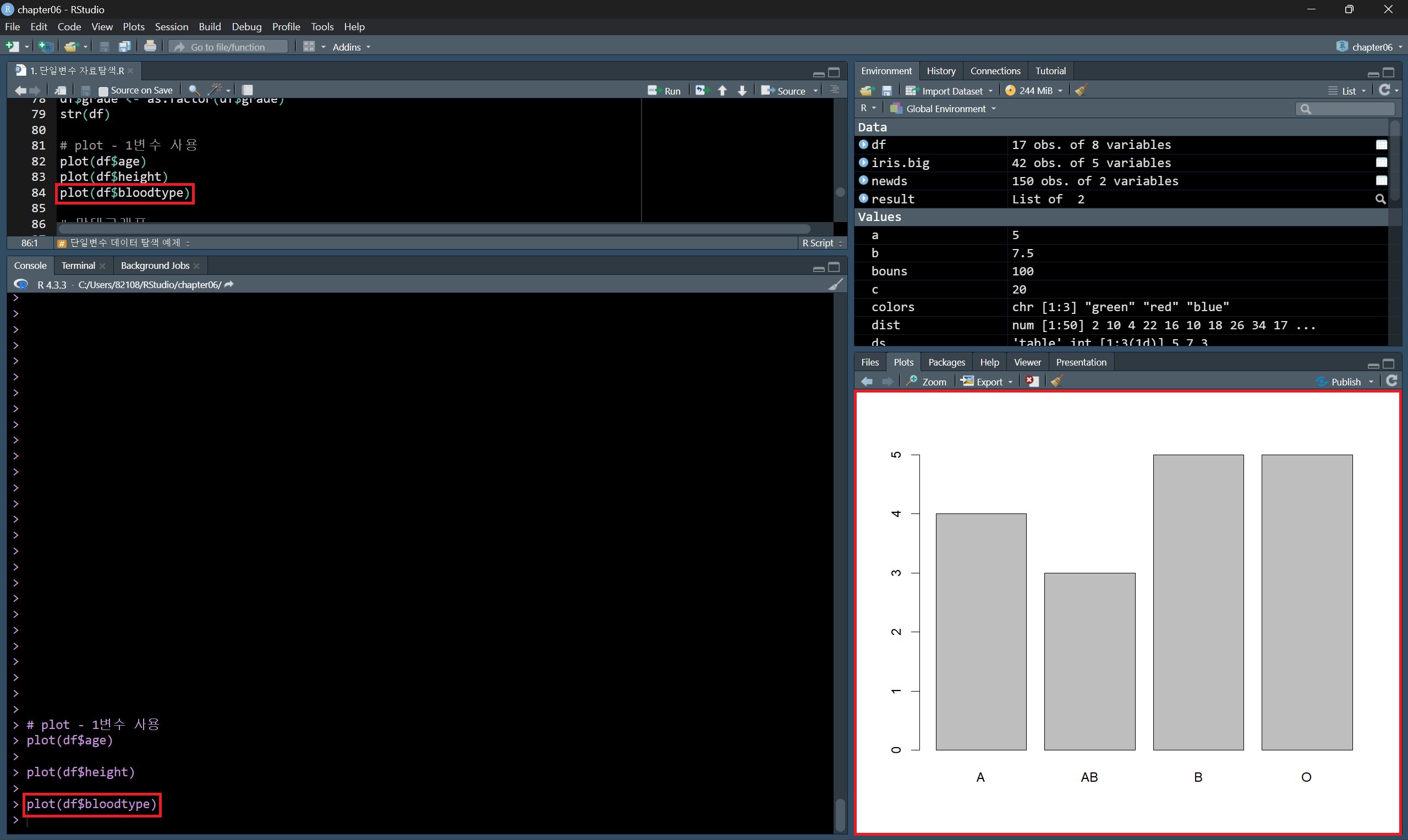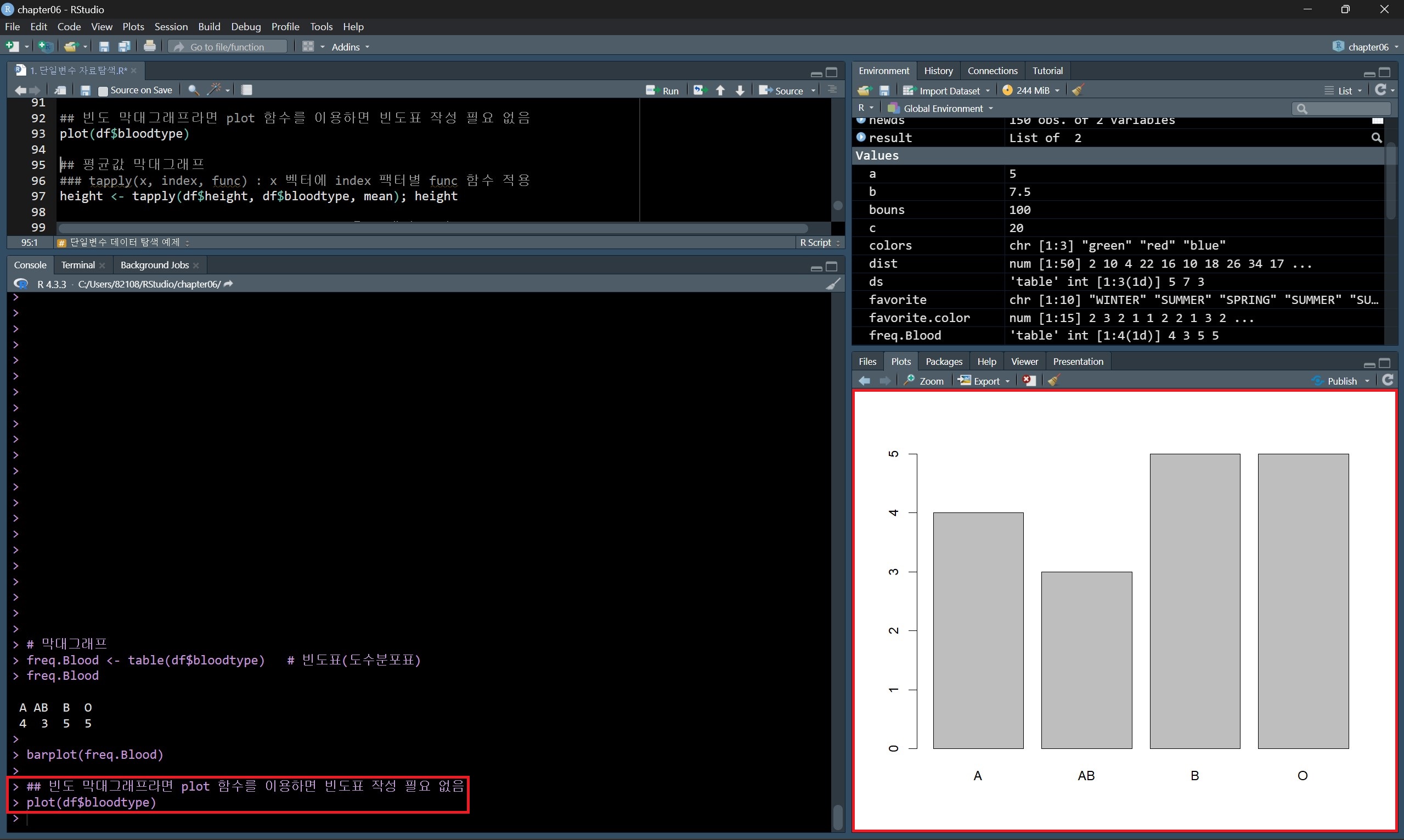 데이터 종류별 값의 개수를 나타내는 빈도 막대그래프를 그린다면 위의 방법처럼 도수분포표를 구하고 barplot() 함수로 그릴 수도 있지만, plot() 함수를 사용하면 도수분포표를 구하지 않고도 빈도 막대그래프를 그릴 수 있다.