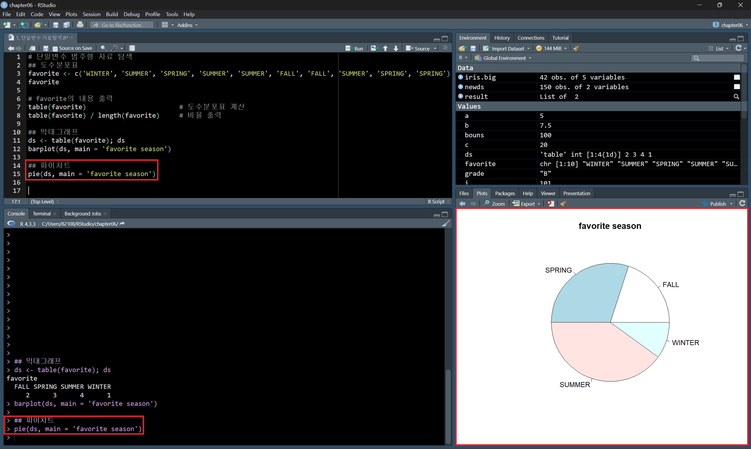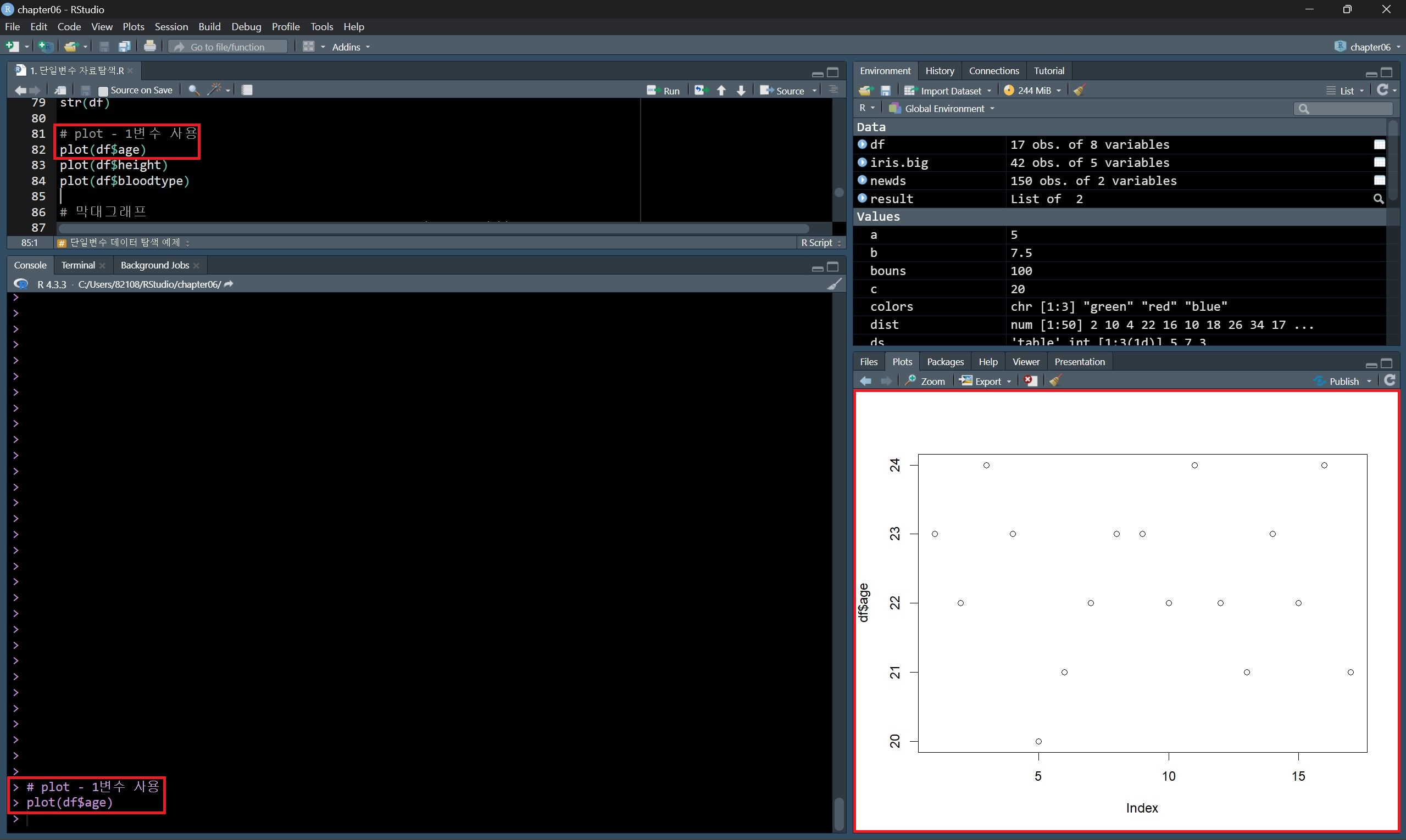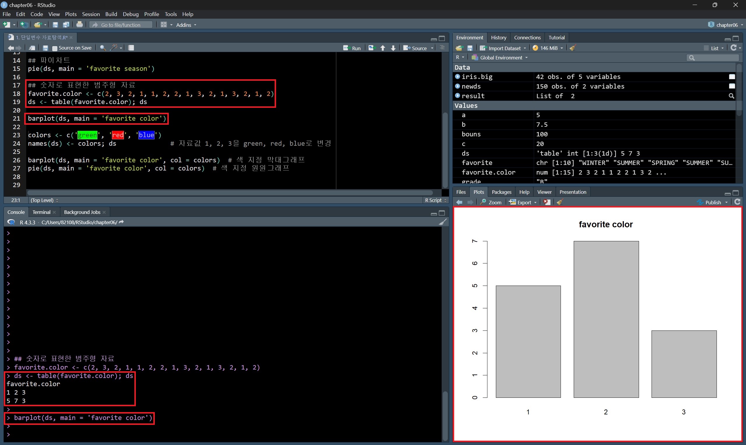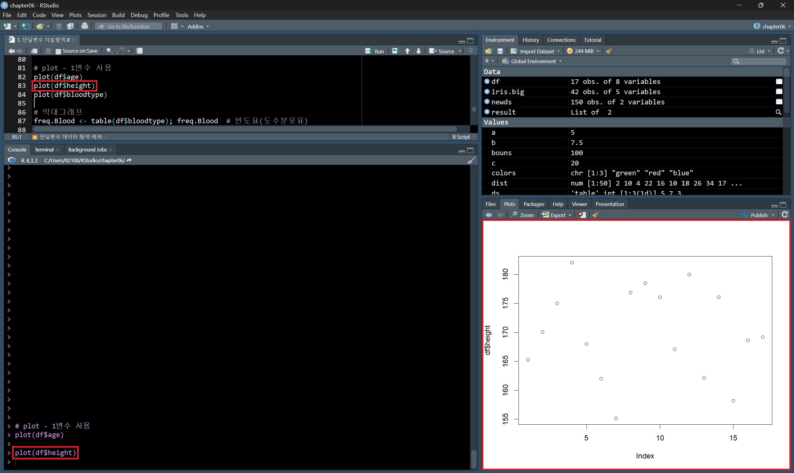 데이터 종류별 값의 개수를 나타내는 빈도 막대그래프를 그린다면 위의 방법처럼 도수분포표를 구하고 barplot() 함수로 그릴 수도 있지만, plot() 함수를 사용하면 도수분포표를 구하지 않고도 빈도 막대그래프를 그릴 수 있다.