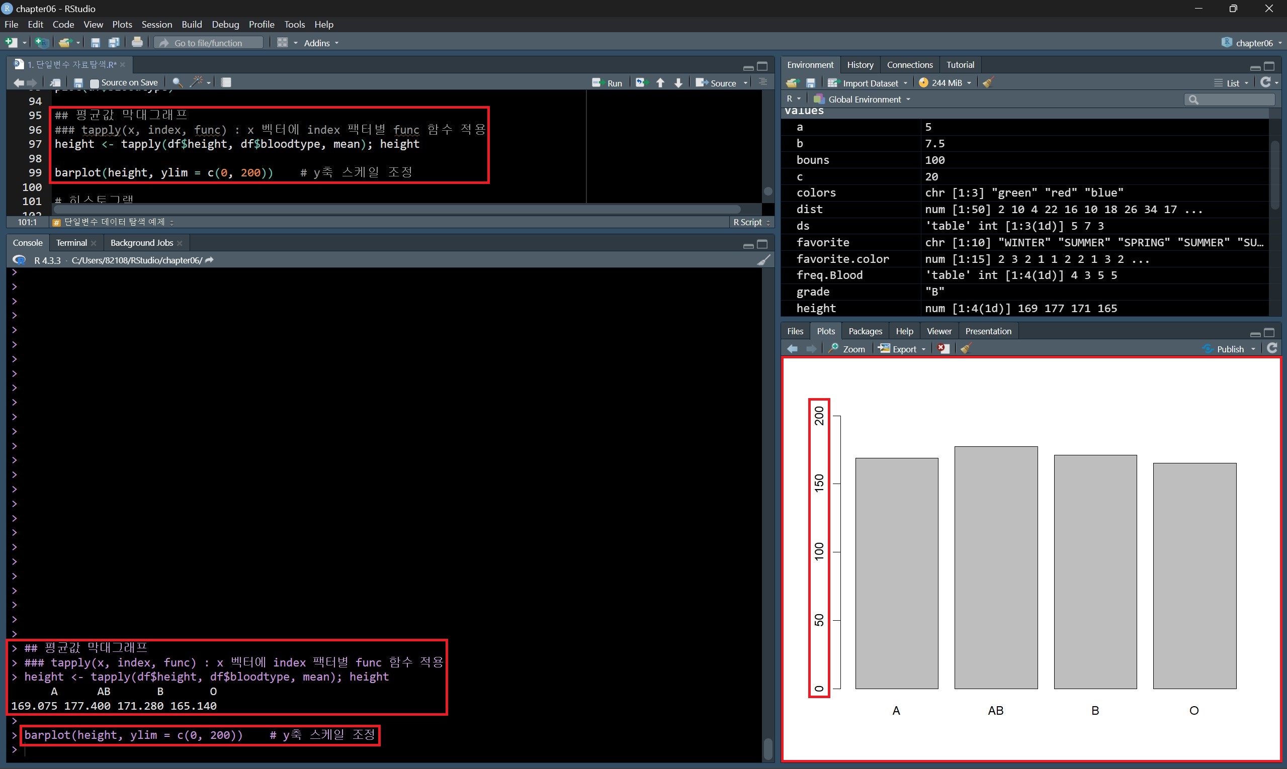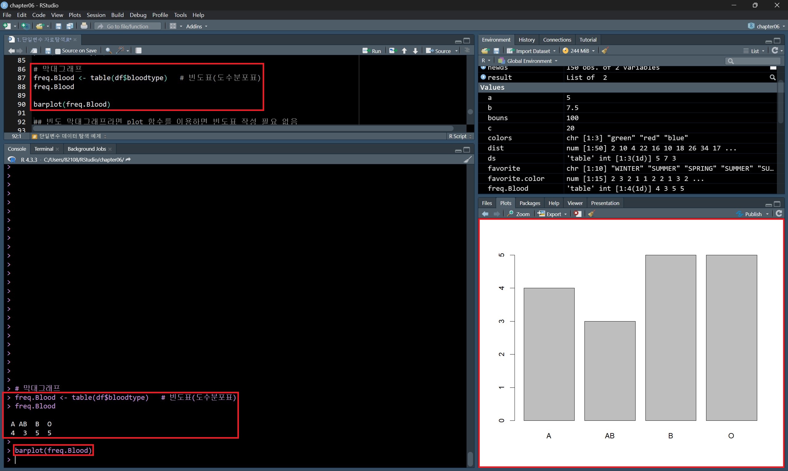 팩터 형태인 bloodtype 변수의 도수분포표를 구하고 이를 barplot() 함수 안에 넣어 막대그래프를 그릴 수도 있다.
