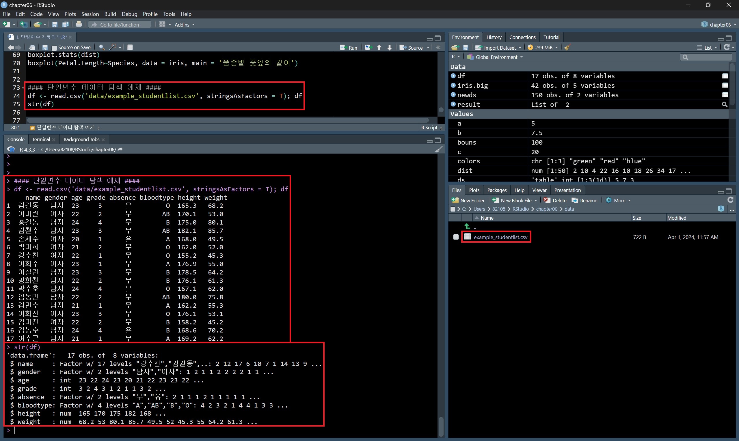 | [R 공부하기] 7. 다중변수 자료 탐색 - 우당탕탕 개발자 되기 프로젝트 (0) | 2024.04.24 |