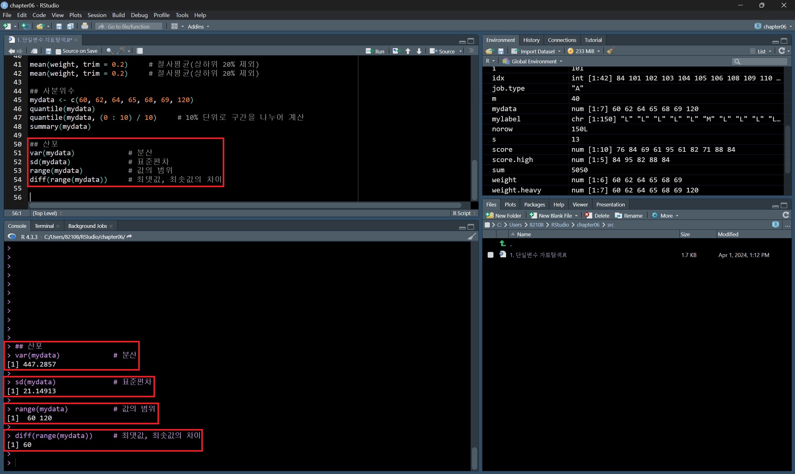 분산은 var() 함수로, 표준편차는 sd() 함수로, 값의 범위는 range() 함수로, 최댓값과 최솟값의 차이는 diff() 함수로 구할 수 있다.