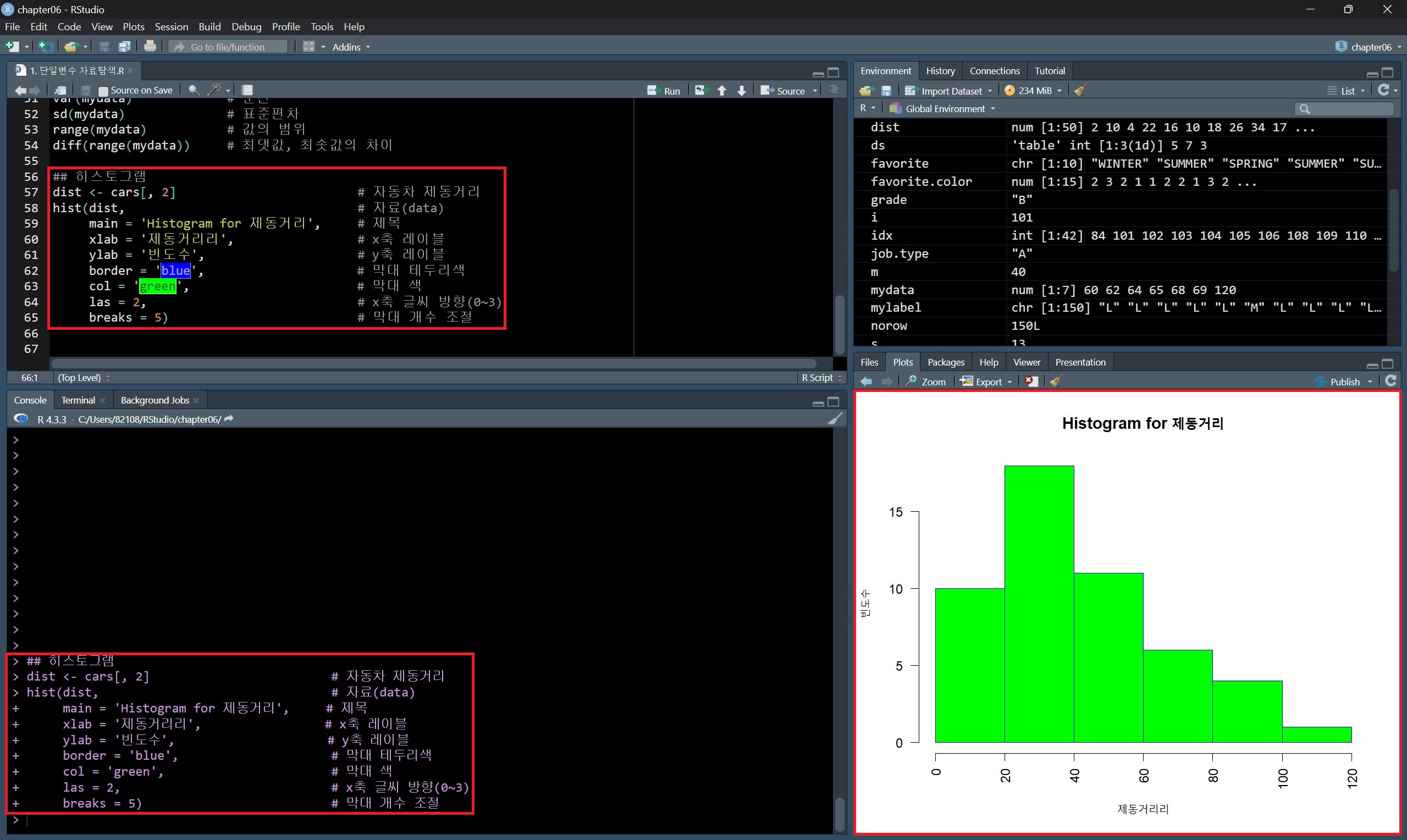 그래프를 그리는 함수에는 많은 매개변수를 지정할 수 있는데, hist() 함수에서 사용한 매개변수를 살펴보면 main, xlab, ylab, border, col, las, breaks 등이 있다.