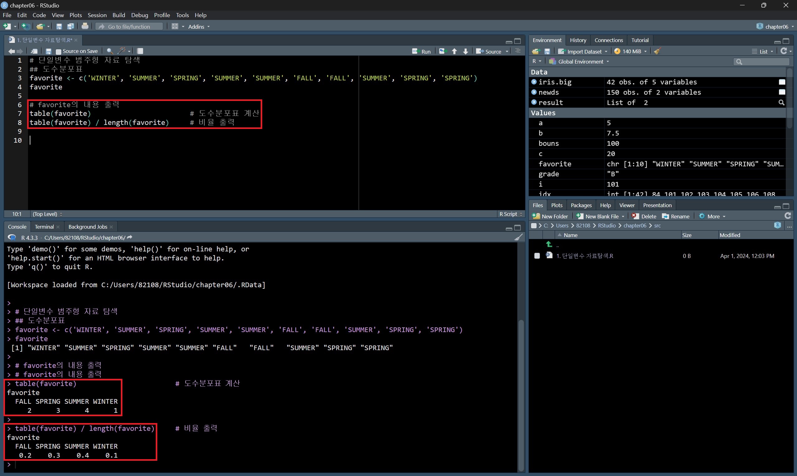 도수분포표는 각 데이터 값의 개수, 즉 데이터 빈도를 나타낸 것으로 table() 함수를 사용한다.