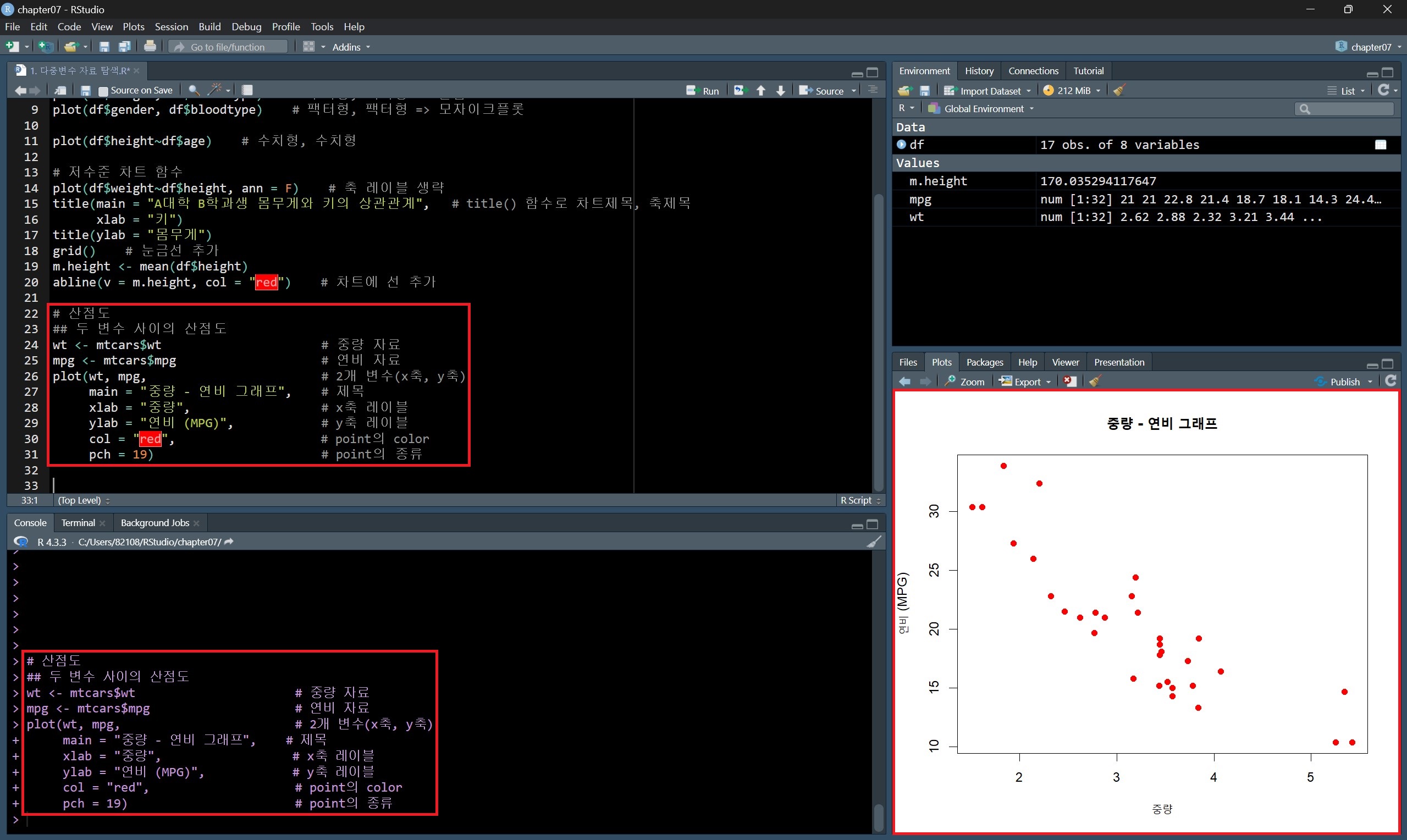 R에서 상관관계를 알아보기 위해 우선 데이터에 대한 산점도를 그린다.
