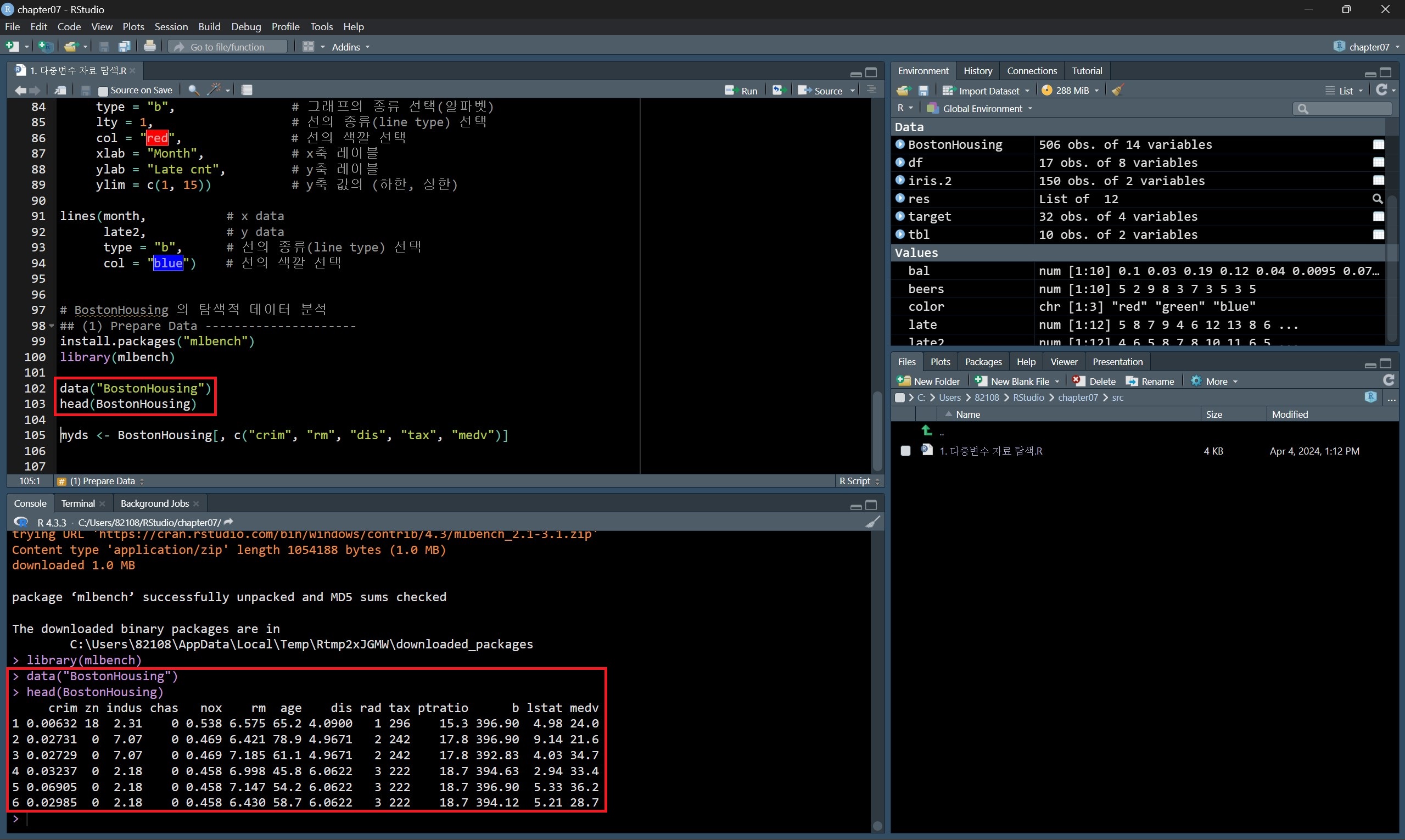 BostonHousing 데이터를 가지고 탐색적 데이터 분석을 수행하기 위해 mlbench 패키지를 설치한다.