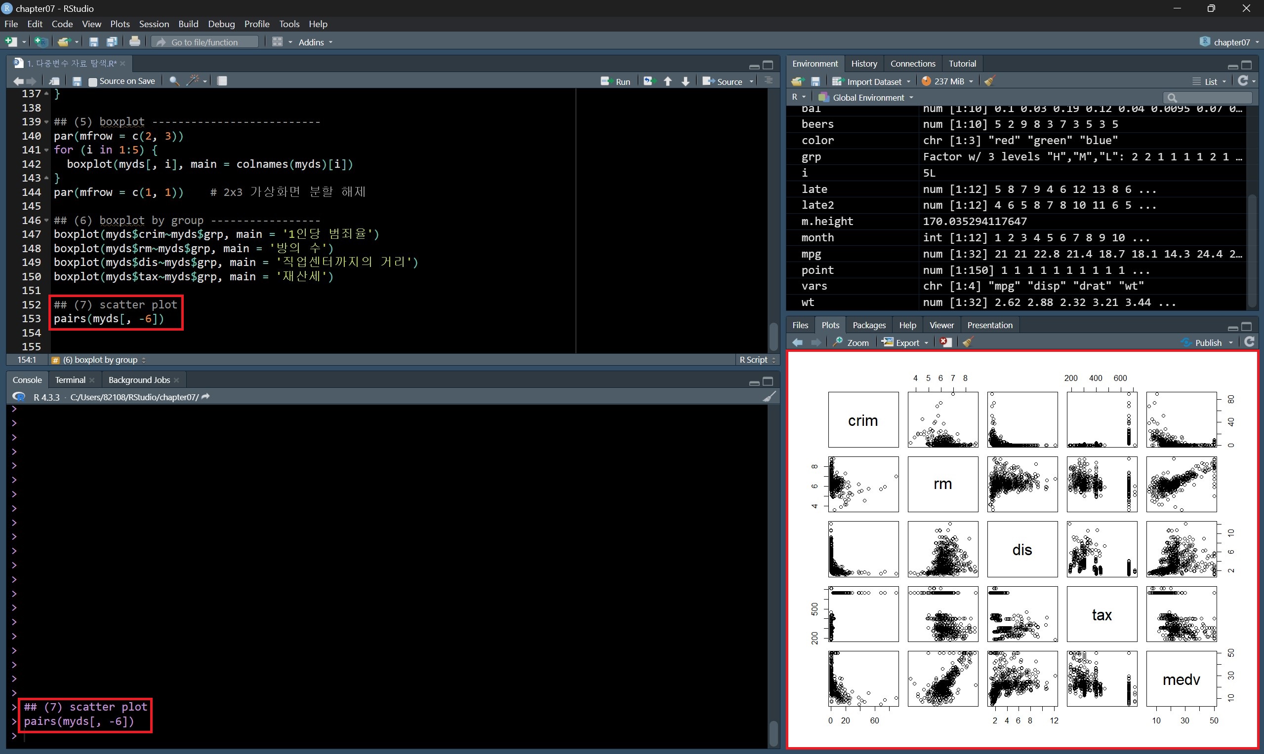 | [R 공부하기] 6. 단일변수 자료 탐색 - 우당탕탕 개발자 되기 프로젝트 (0) | 2024.04.23 |