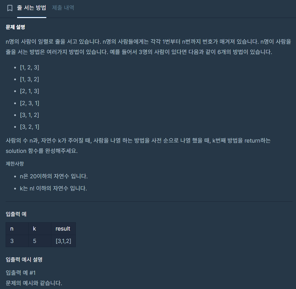만약 k를 팩토리얼 값으로 나눈 나머지가 0이면 남아있는 숫자들의 조합 중 마지막 조합을 의미하므로 나눈 몫에서 -1을 해준 위치의 숫자를 정답 리스트에 추가한다.