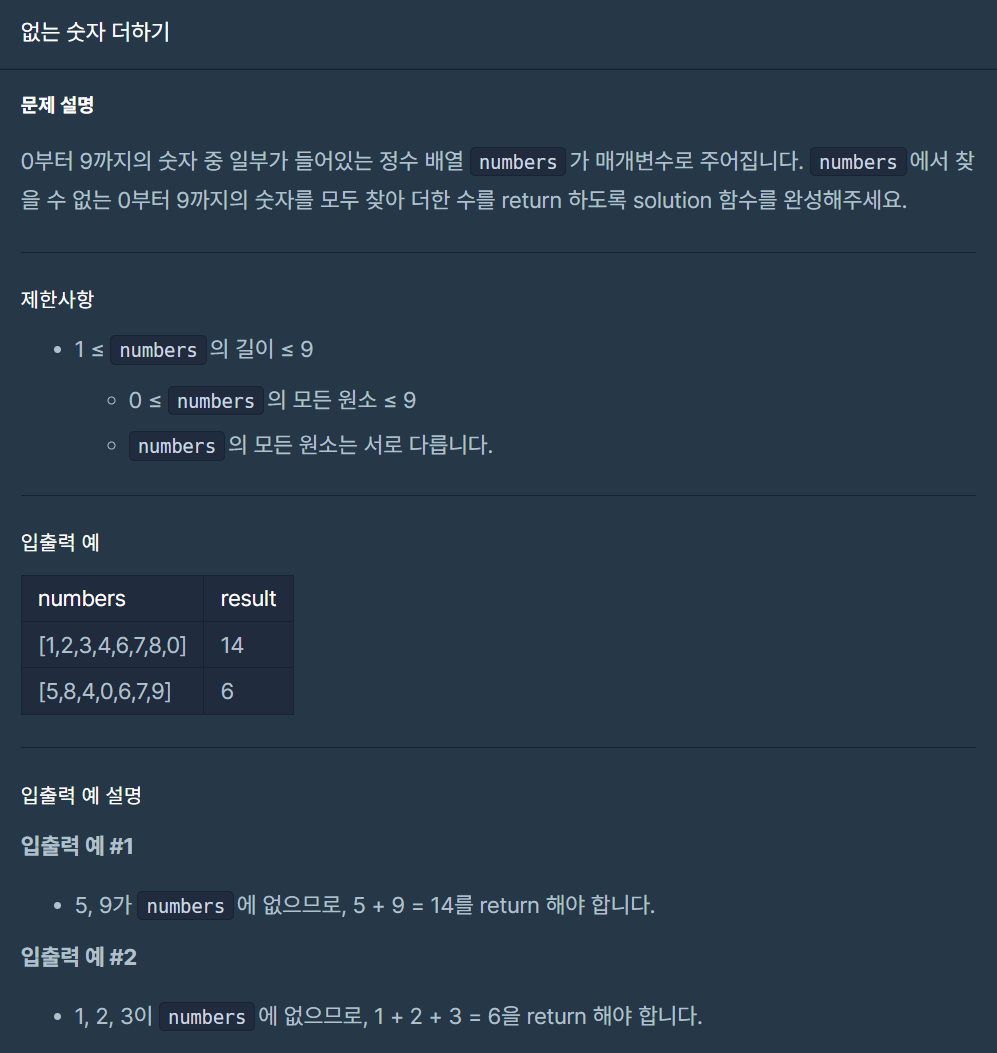 - 만약 매개변수로 입력받은 숫자 배열에서 0부터 9까지 수를 각각 불러왔을 때 해당 값이 없으면 (숫자 배열에서 해당 값의 개수가 0이면) if (numbers.count(i) == 0)