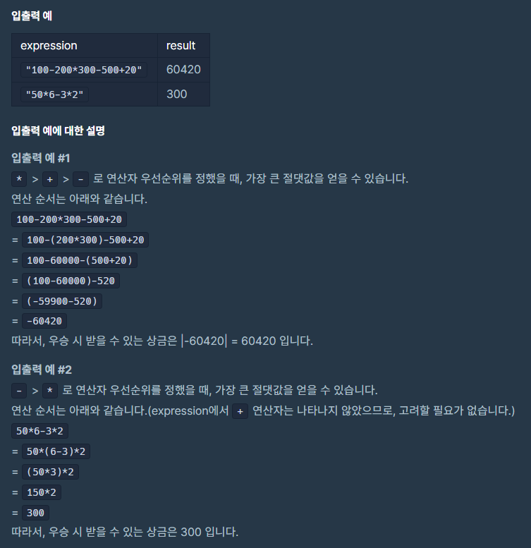 해당 문제는 각 +, -, * 연산자의 우선순위에 따라 수식을 계산한 결과 중 절댓값이 가장 큰 값을 출력하는 문제이다.